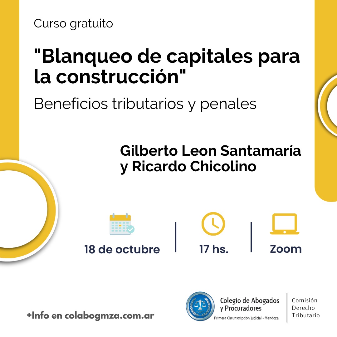 «Blanqueo de capitales para la construcción. Beneficios tributarios y penales» es el nombre de un curso gratuito y virtual que ofrece el Colegio de Abogados de Mendoza destinado a profesionales del Derecho interesados en el tema. Se realizará el martes 18 de octubre, a partir de las 17, por Zoom. Estará a cargo de Gilberto León Santamaría y Ricardo Chicolino y los interesados en participar pueden inscribirse en el siguiente formulario online: inscripciones.colabogmza.com.ar