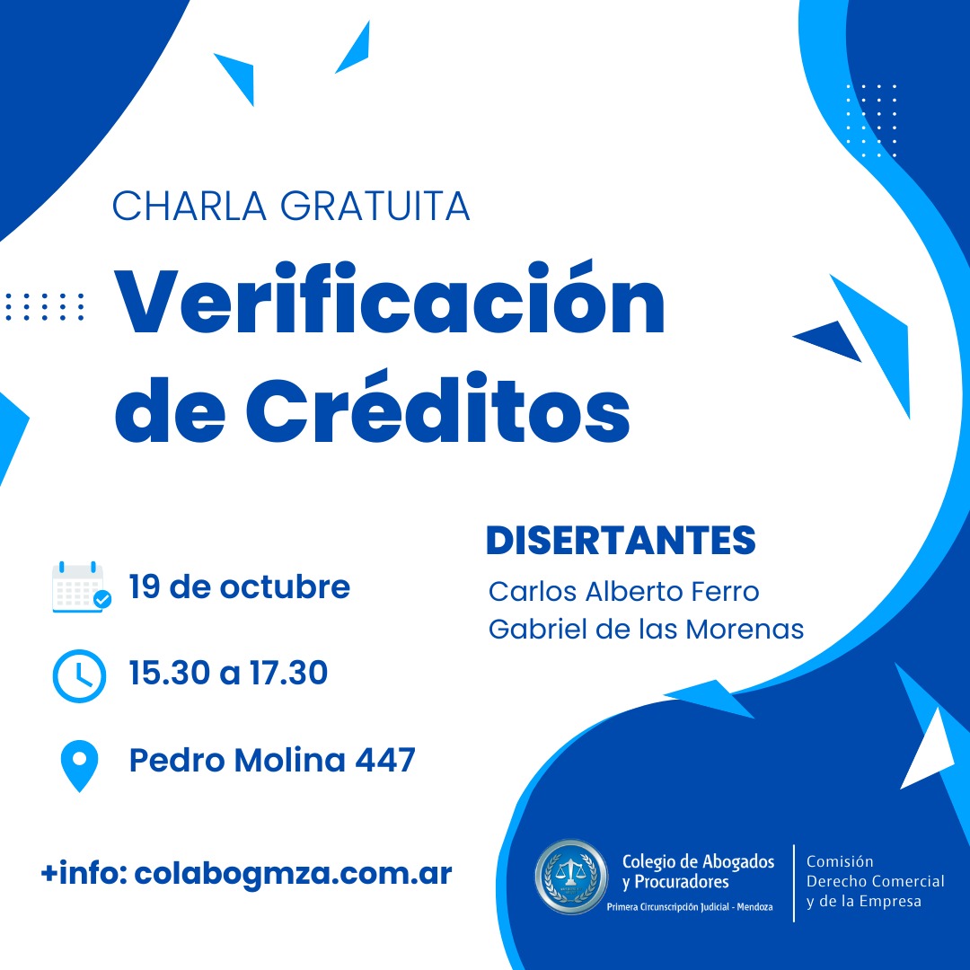 «Verificación de Créditos» es el nombre de una charla gratuita que ofrece el Colegio de Abogados de Mendoza, destinada a profesionales del Derecho, contadores y público en general. Será el miércoles 19 de octubre, de 15.30 a 17.30, en el salón de sillas azules de la sede del Colegio ubicado en Pedro Molina 447 de la Ciudad de Mendoza. Disertarán Carlos Alberto Ferro y Gabriel de las Morenas. Los interesados deberán inscribirse previamente en inscripciones.colabogmza.com.ar, ya que los cupos son limitados.