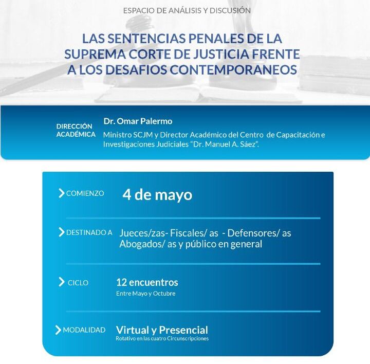 “Las sentencias penales de la Suprema Corte de Justicia frente a los desafíos contemporáneos” es el nombre de un ciclo de formación gratuito destinado a jueces, fiscales, defensores, abogados y público en general interesado en la temática. Comienza el miércoles 4 de mayo y se extenderá hasta octubre. En total serán 12 encuentros, con modalidad virtual y presencial, rotativos en las cuatro Circunscripciones.