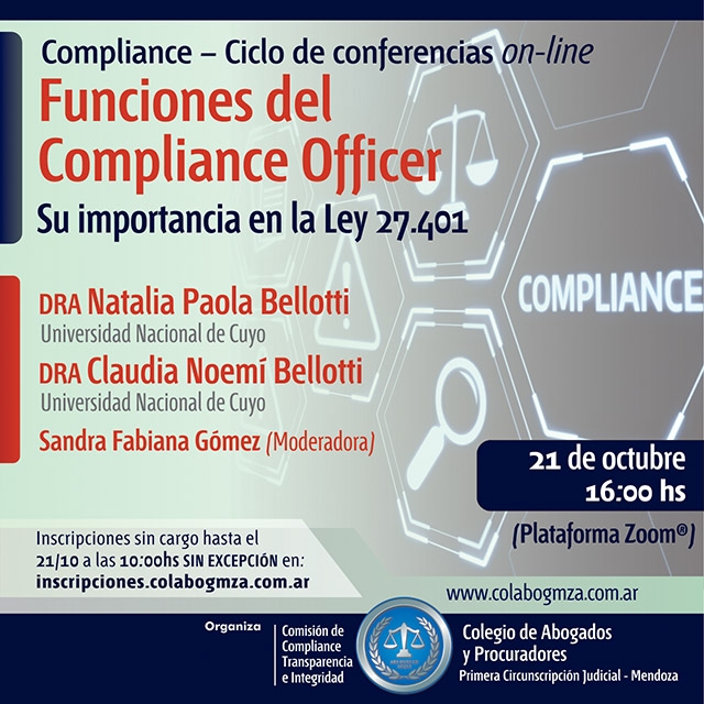 “Funciones del Compliance Officer. Su importancia en la Ley 27.401” es el tema del primero de una serie de encuentros previstos por la Comisión de Compliance, Transparencia e Integridad del Colegio de Abogados y Procuradores de la Primera Circunscripción Judicial de Mendoza. Se realizará, gratis a través de Zoom, el jueves 21 de octubre a las 16.