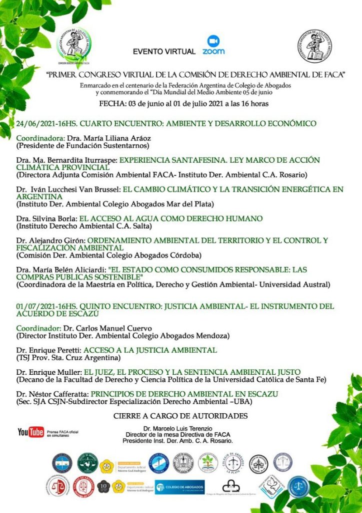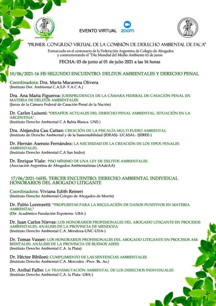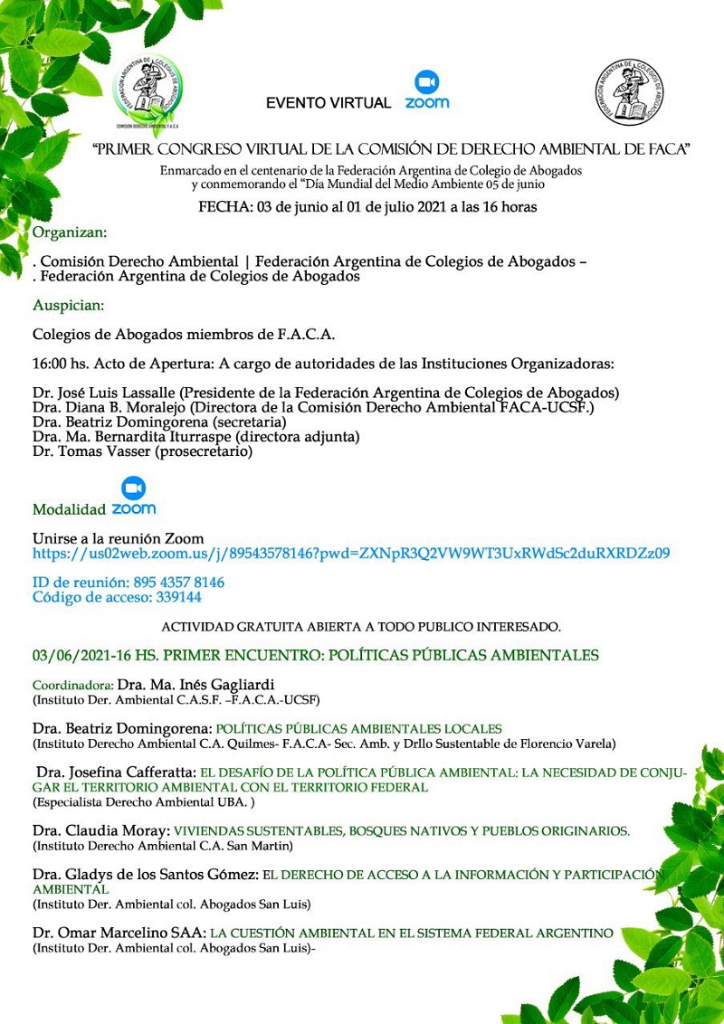 La Comisión de Derecho Ambiental de la Federación Argentina de Colegios de Abogados (FACA) organiza el “Primer Congreso Virtual de la Comisión de Derecho Ambiental de FACA”. Es gratuito y está enmarcado en el centenario de la Federación Argentina de Colegio de Abogados y conmemorando el día mundial del medio ambiente, se desarrollará todos los jueves desde el jueves 3 de junio al 1 de julio a las 16 por Zoom.