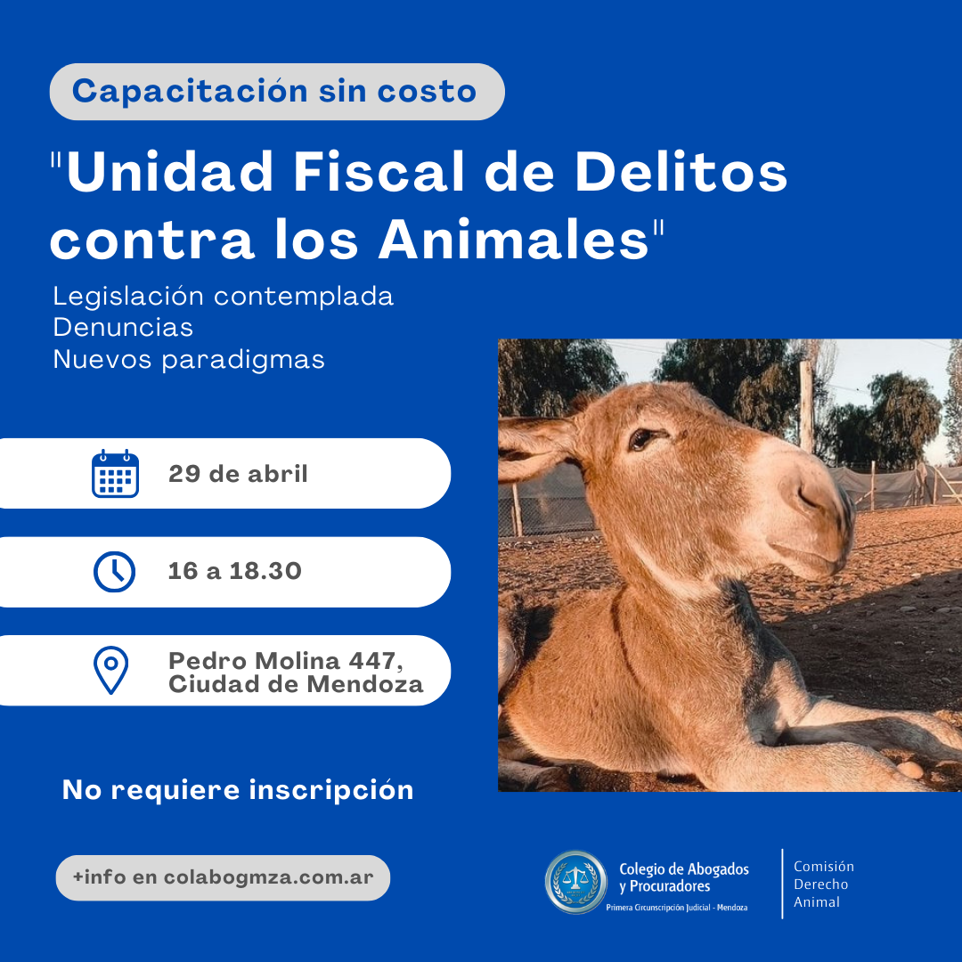 La implementación de la Unidad Fiscal de Delitos contra los Animales, legislación vigente y nuevos paradigmas es el tema de una capacitación sin costo del Colegio de Abogados. Será el 29 de abril, de 16 a 18.30, en la sede ubicada en Pedro Molina 447 de Ciudad.