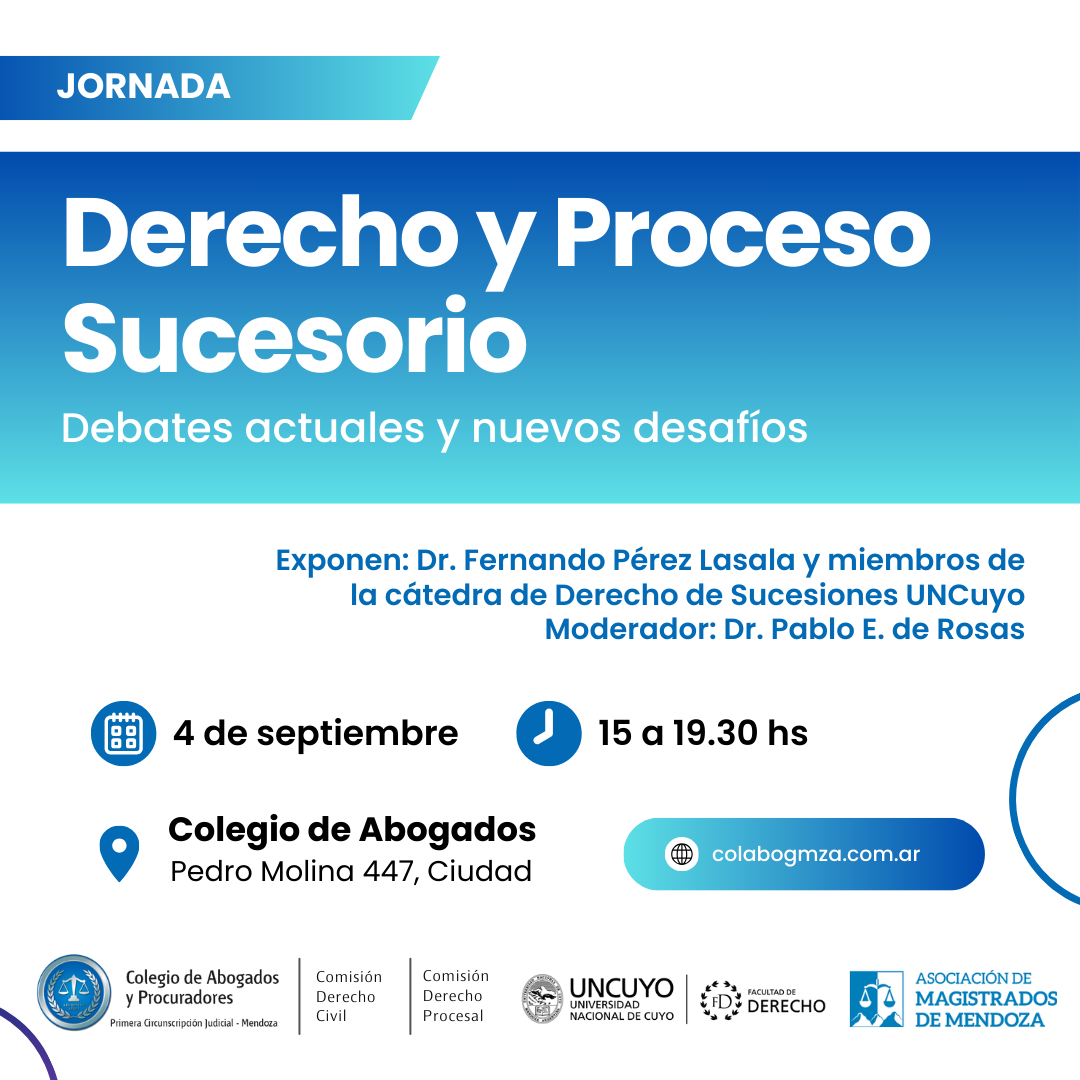 Profesionales del Derecho, procuradores, magistrados, funcionarios judiciales y estudiantes de abogacía podrán participar de la «Jornada sobre Derecho y Proceso Sucesorio». Se realizará el miércoles 4 de septiembre, de 15 a 19.30, en la sede del Colegio de Abogados ubicada en Pedro Molina 447 de Ciudad.