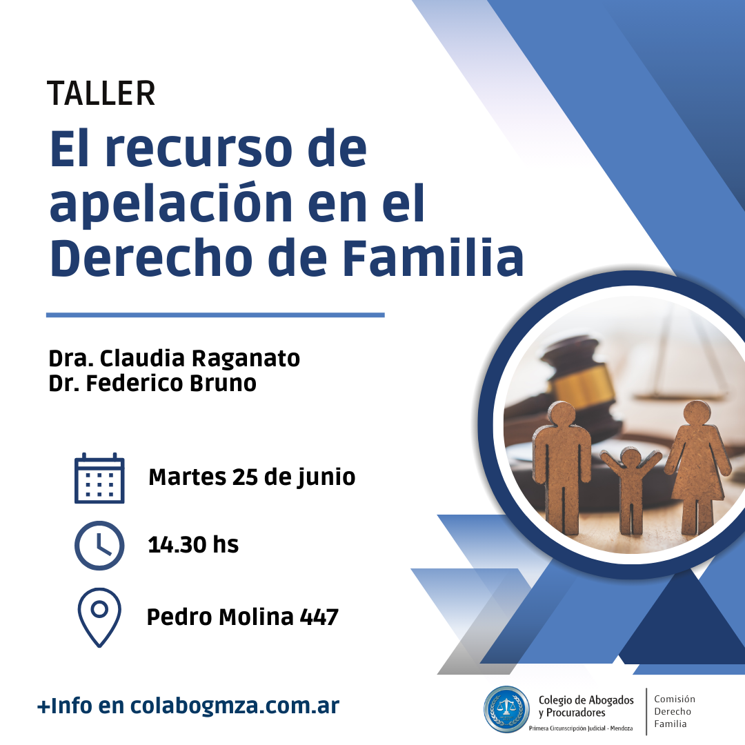 Profesionales del derecho que ejercen su labor en el fuero de Familia podrán inscribirse en el taller «Recurso de apelación en el Derecho de Familia». Se realizará el martes 25 de junio, de 14.30 a 18.30, en el salón de actos del Colegio de Abogados ubicado en Pedro Molina 447 de Ciudad.