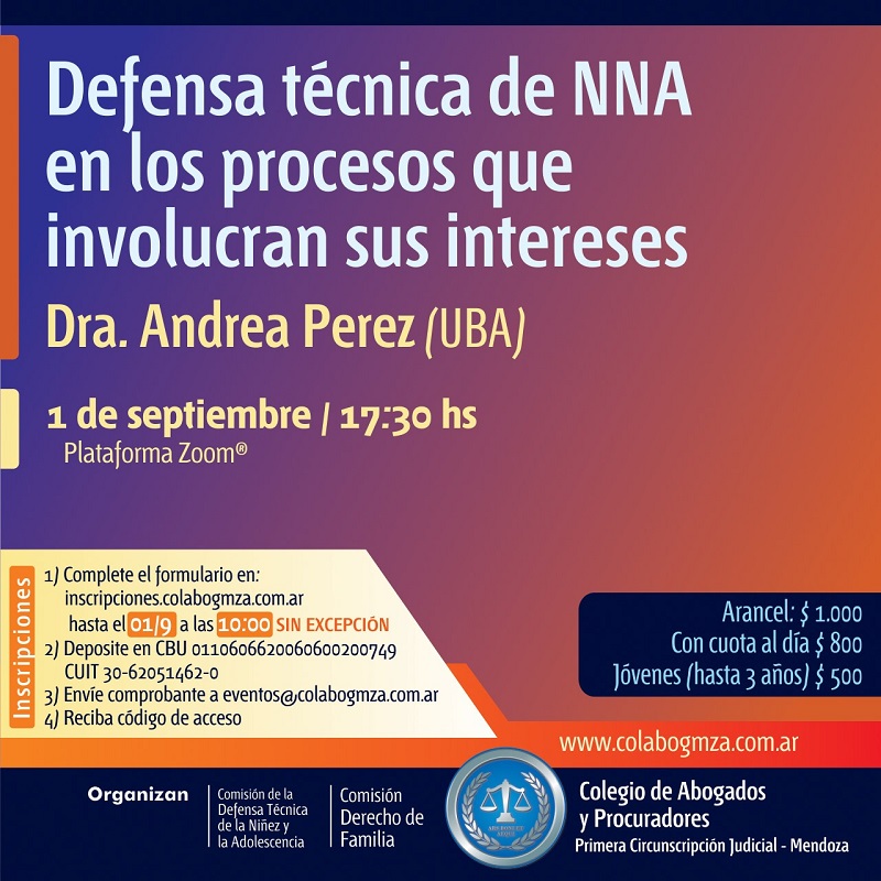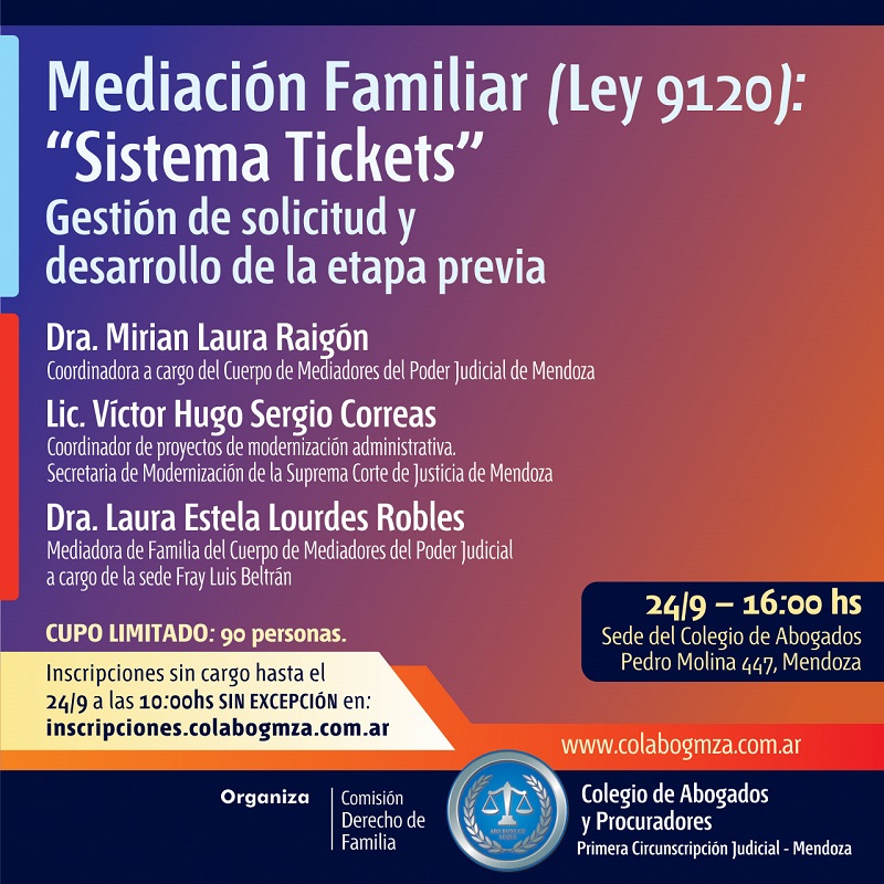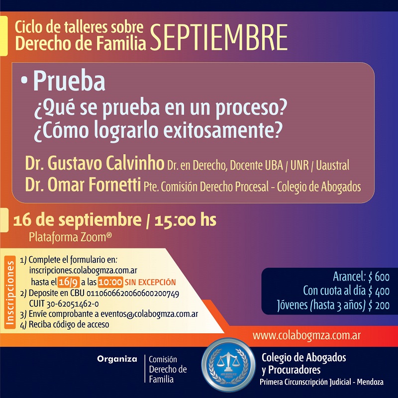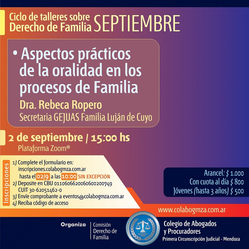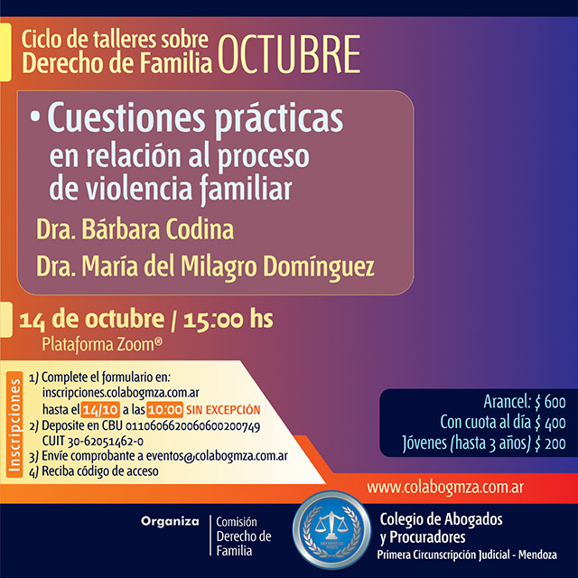 Se trata de un ciclo sobre Derecho de Familia que se dictará en cuatro módulos en el Colegio de Abogados de Mendoza. Comienza el martes 17 de mayo desde las 15. Inscripciones abiertas on line en: inscripciones.colabogmza.com.ar