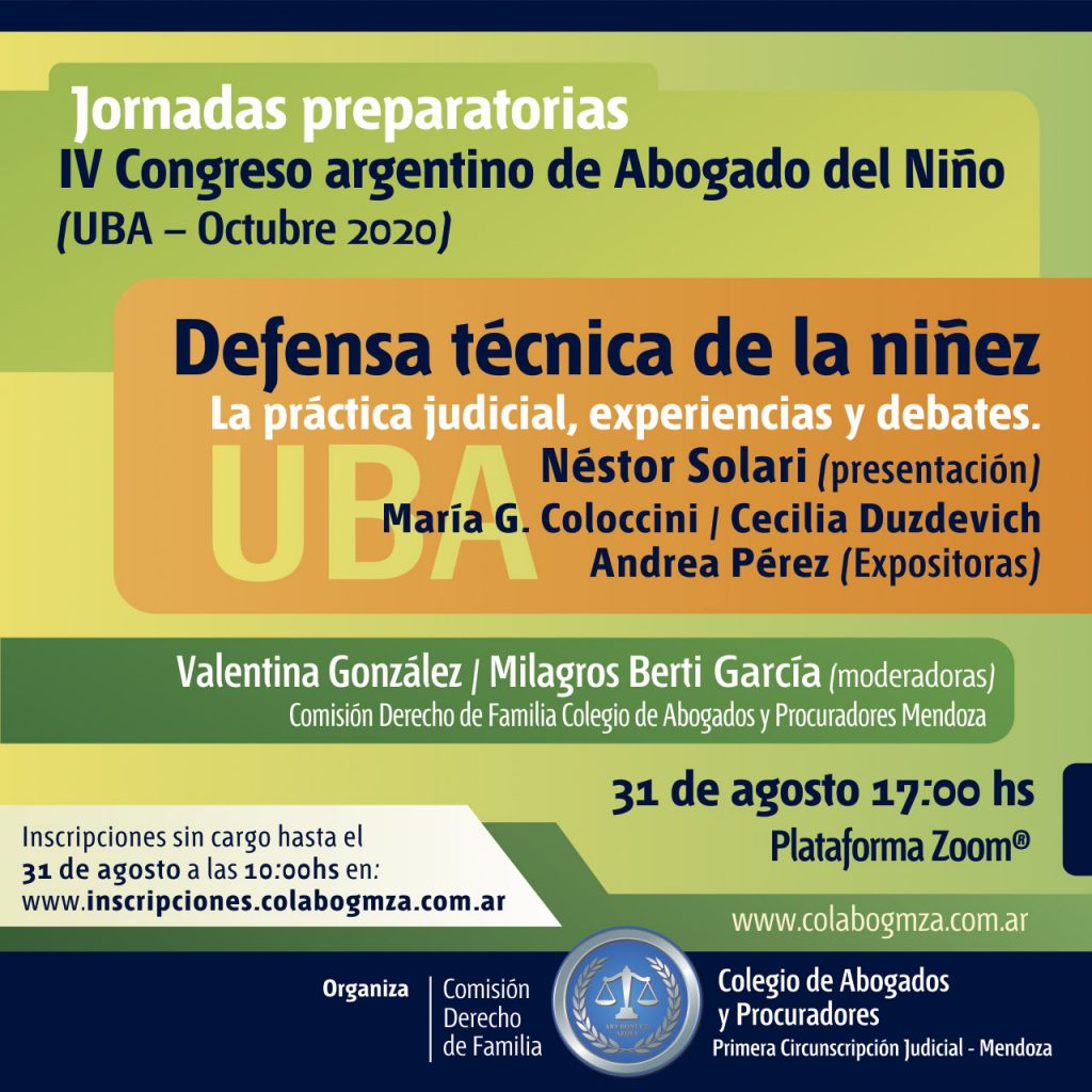 Serán la previa del IV Congreso Argentino de Abogado del Niño. Las Jornadas locales tendrán lugar en el Zoom del Colegio de Abogados y Procuradores el lunes 31 de agosto a las 17. Las inscripciones serán sin cargo hasta las 10 de ese mismo día en: inscripciones.colabogmza.com.ar