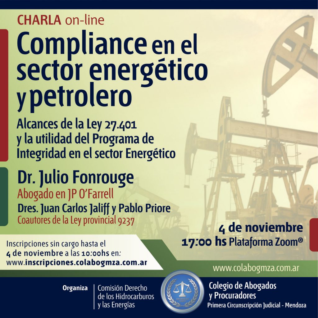 El encuentro, previsto para el miércoles 4 de noviembre a las 17, busca analizar los alcances de la Ley 27.401 y la utilidad del Programa de Integridad en el sector Energético en general.