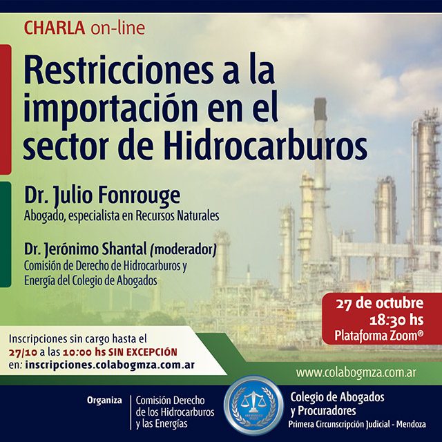 El abogado especialista en recursos naturales, Julio C. Fonrouge, disertará sobre las restricciones a la importación en el sector de hidrocarburos. Será el miércoles 27 de octubre a las 18.30 a través de la plataforma Zoom del Colegio de Abogados y Procuradores de la Primera Circunscripción Judicial de Mendoza.
