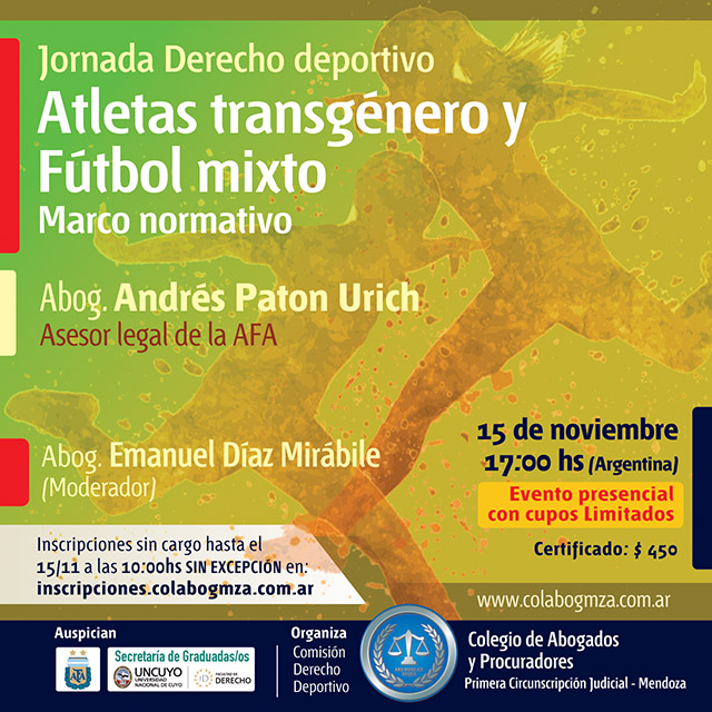 El encuentro presencial reunió, en el auditorio del Colegio de Abogados de la Primera Circunscripción Judicial de Mendoza, al asesor legal de la Asociación del Fútbol Argentino (AFA) Andrés Paton Urich, al presidente de la Comisión de Derecho Deportivo del Colegio, Emanuel Díaz Mirábile, y profesionales del Derecho interesados en el tema que se desarrolló; “Atletas transgénero en competiciones y el fútbol mixto: marco normativo”.