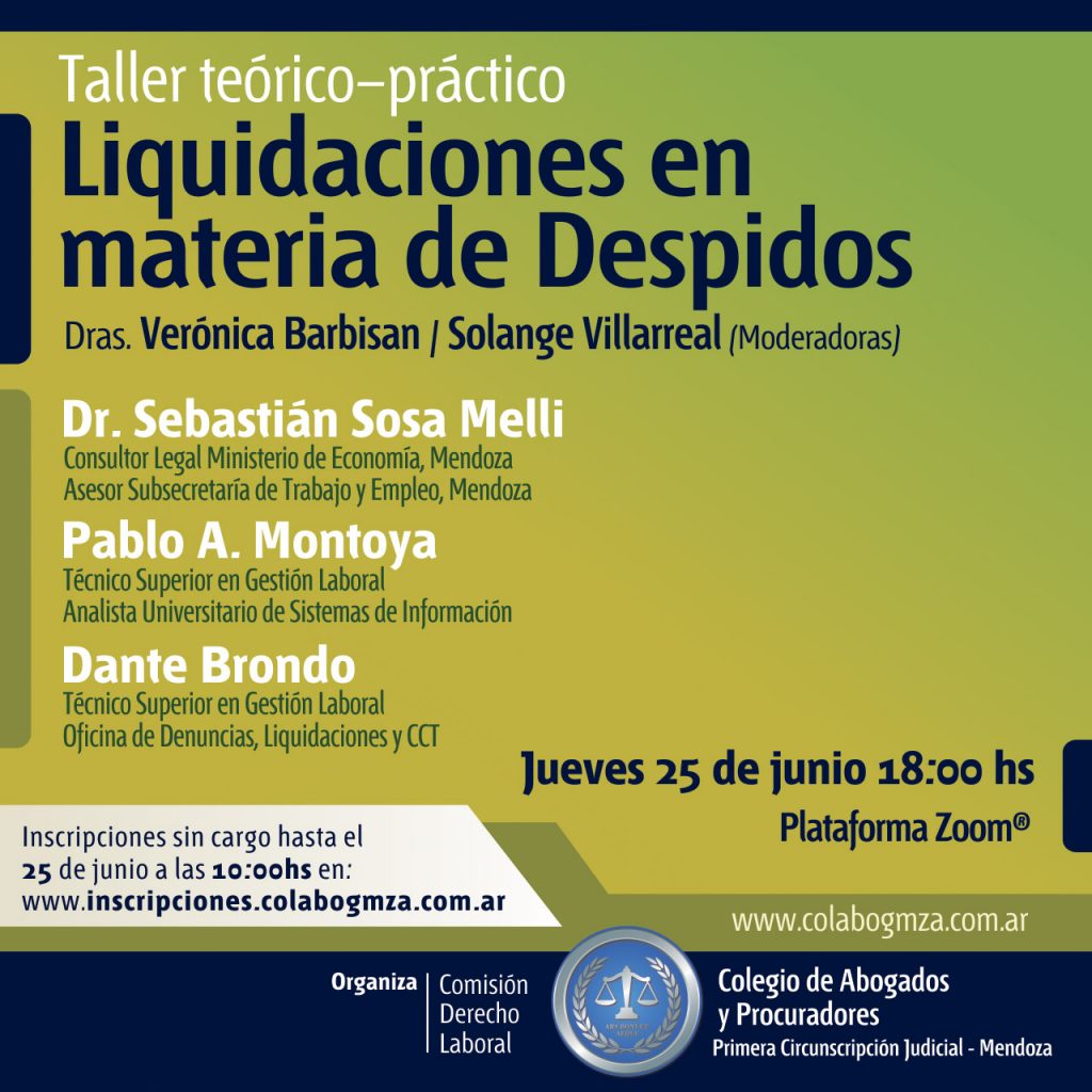 Un taller sobre “Liquidaciones en materia de despido” tendrá lugar en el zoom del Colegio de Abogados y Procuradores. Estará a cargo de Sebastián Sosa Melli, Pablo Montoya y Dante Brondo.