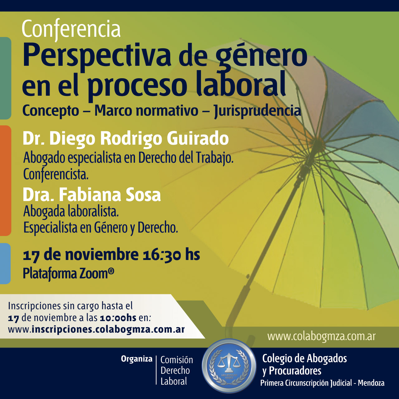 Será en una jornada gratuita en la que disertarán especialistas en Derecho del Trabajo con perspectiva de género. Está prevista para el martes 17 de noviembre a las 16.30. Los interesados pueden inscribirse hasta ese mismo día a las 10 en inscripciones.colabogmza.com.ar