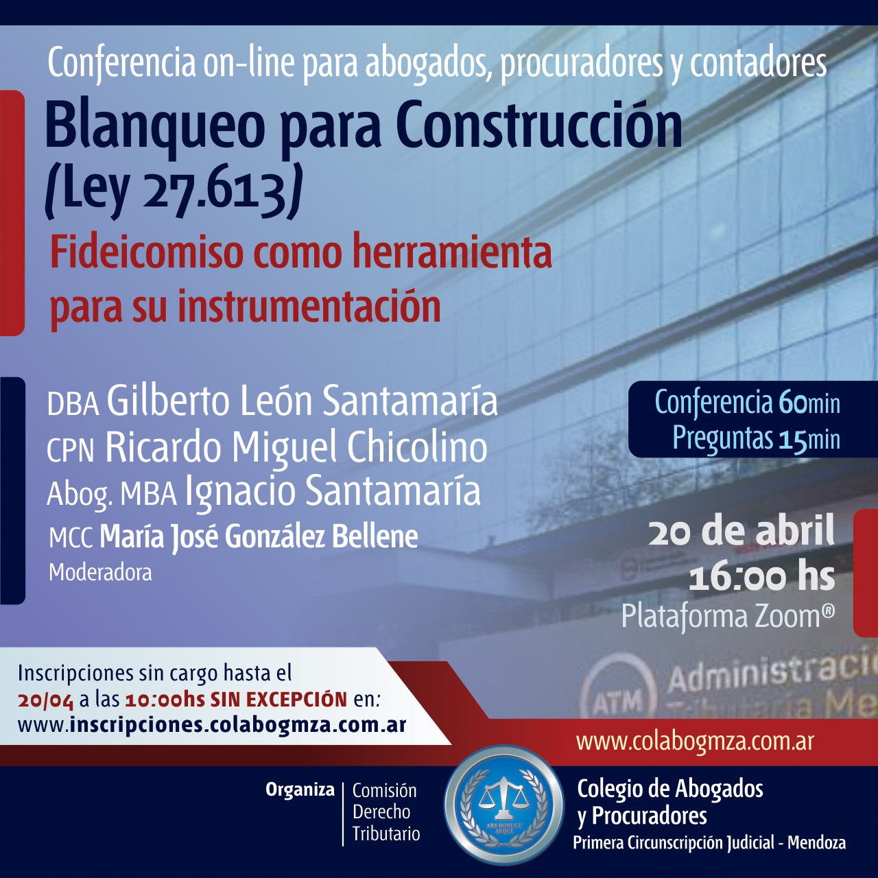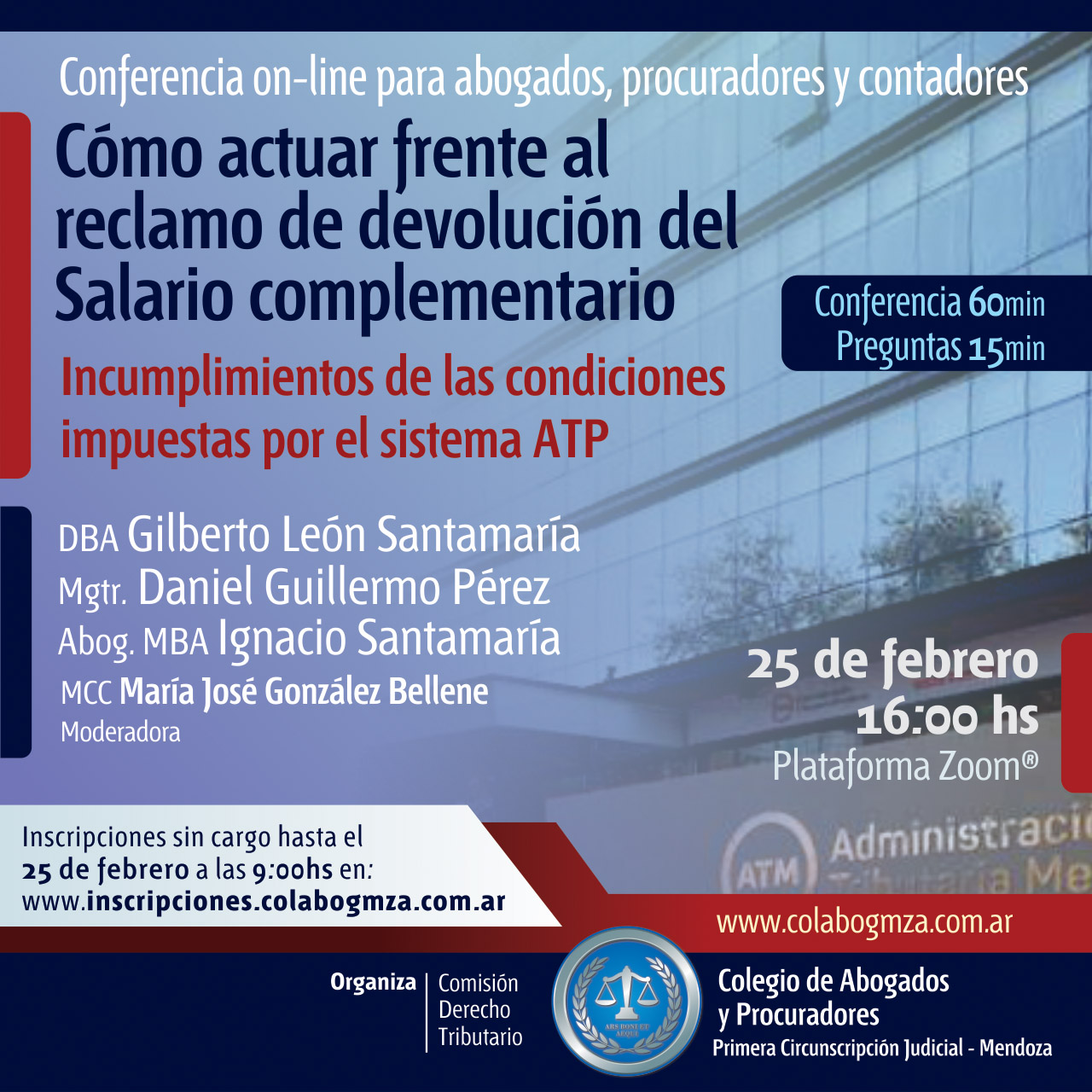 Los interesados podrán inscribirse sin cargo y solicitar el ID de ingreso al sitio on line con un click en: inscripciones.colabogmza.com.ar, hasta el mismo día a las 10 sin excepciones.