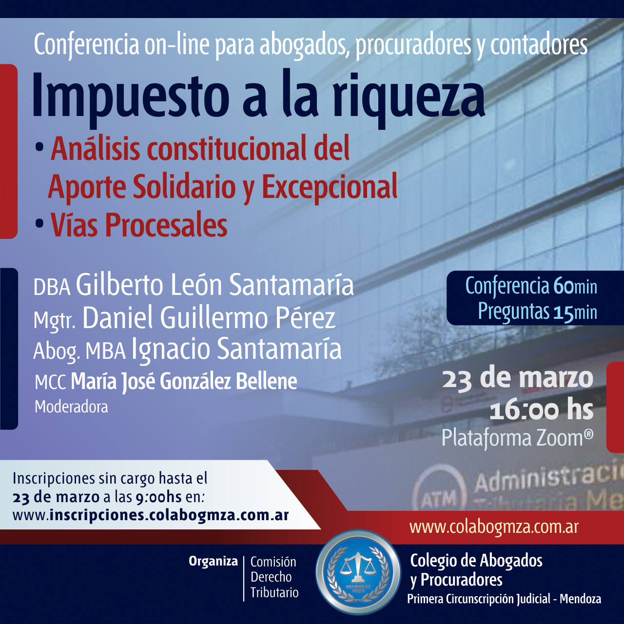 Será en un encuentro gratuito en el que especialistas en Derecho Tributario analizarán el aporte solidario y excepcional desde el punto de vista constitucional y las vías procesales. Está previsto para el martes 23 de marzo a las 16 por Zoom. Ya es posible anotarse en: inscripciones.colabogmza.com.ar