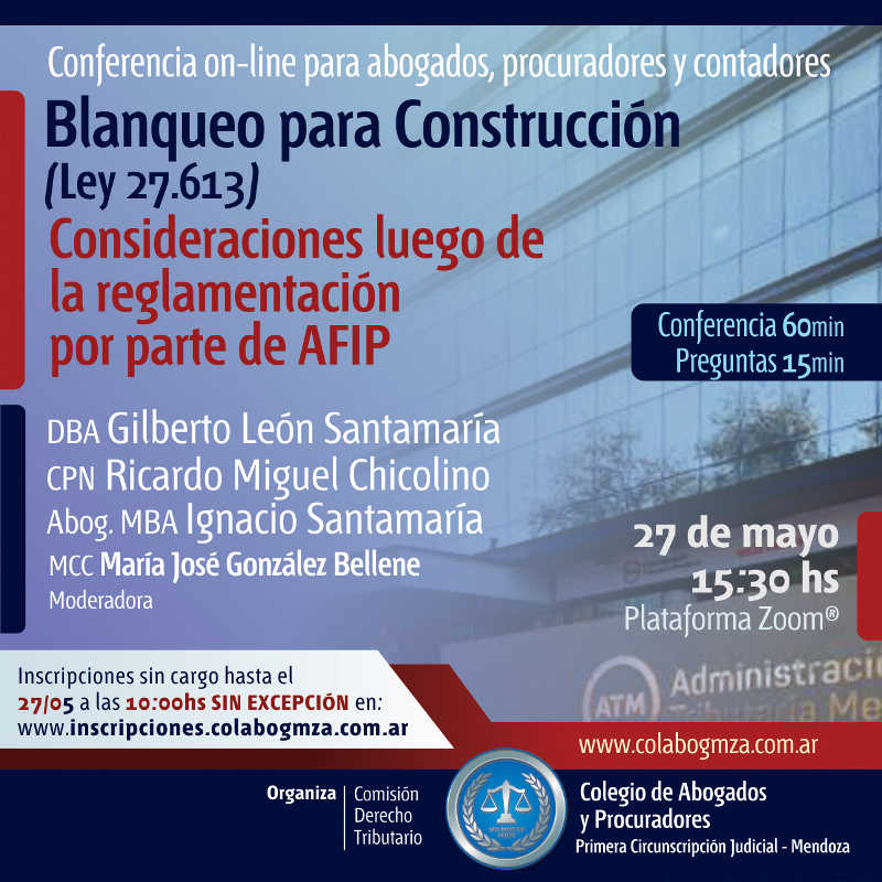 La Comisión de Derecho Tributario del Colegio de Abogados y Procuradores de la Primera Circunscripción Judicial continúa su ciclo de conferencias para este año con un análisis de la Ley 27.613; Blanqueo para Construcción. Consideraciones luego de la Reglamentación por parte de AFIP.