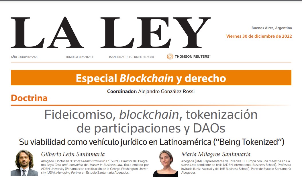 El referente de la Comisión de Derecho Tributario del Colegio de Abogados y Procuradores de la Primera Circunscripción Judicial de Mendoza, Gilberto León Santamaría y la María Milagros Santamaría participaron en el Especial Blockchain y Derecho, de Editorial La Ley, a través de un artículo Doctrinario: » Fideicomiso, Blockchain, tokenización de participaciones y las Decentralized Autonomous Organization (DAOs) en LATAM iniciando por el análisis de su viabilidad en Argentina y Panamá, continuando con México y Colombia, entre otros países analizados. Su viabilidad como vehículo jurídico en Latinoamérica ( Being Tokenized).