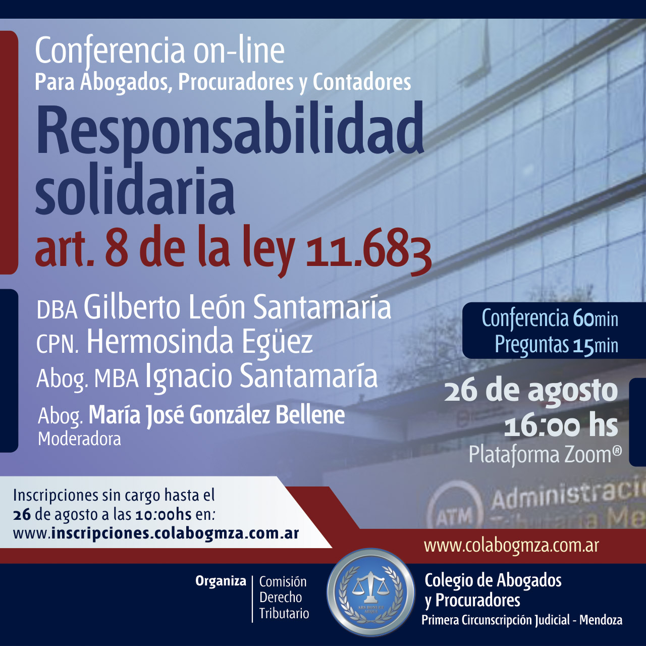 La conferencia será gratuita y tendrá lugar a través de la plataforma Zoom del Colegio el martes 24 de noviembre a las 16. Los interesados pueden inscribirse y solicitar el ID de ingreso a la plataforma que les llegará por correo electrónico en inscripciones.colabogmza.com.ar, hasta el mismo día a las 10.