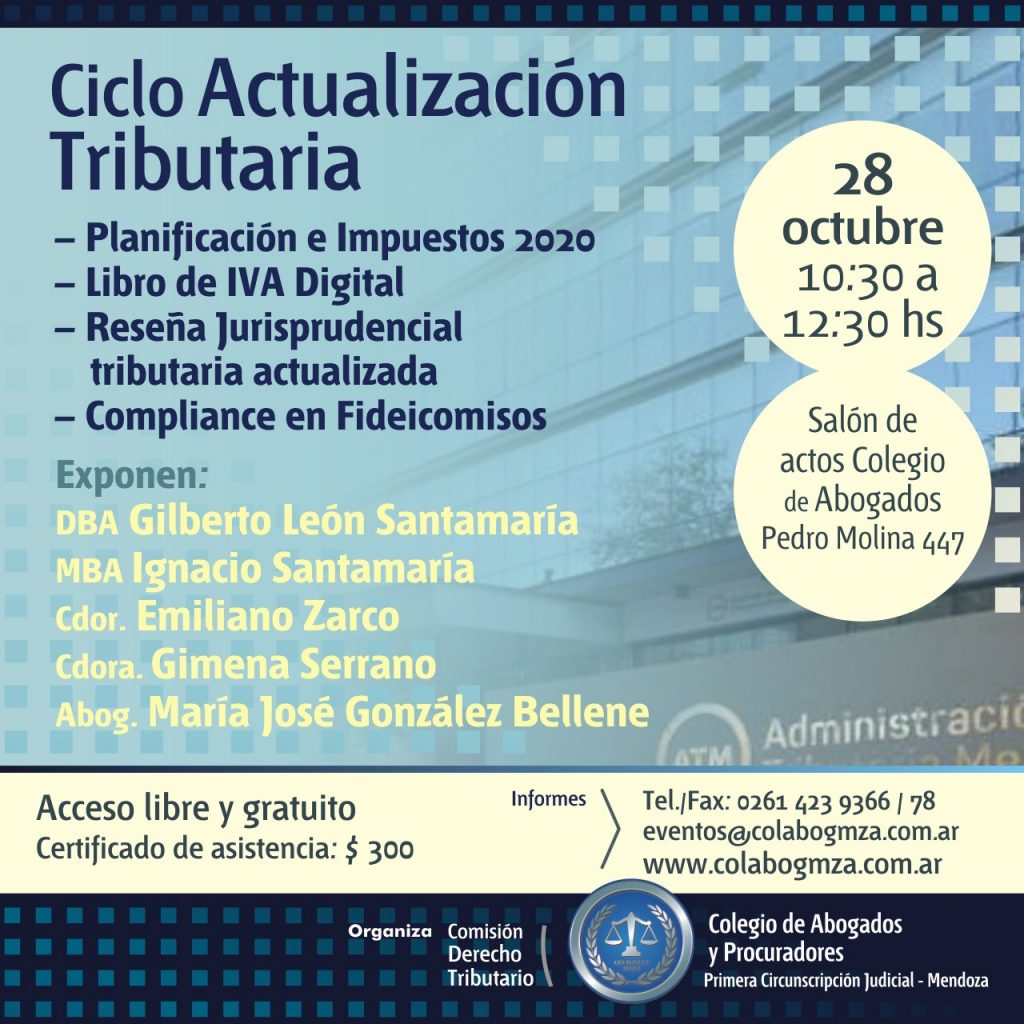 Planificación e Impuestos 2020, Libro de IVA Digital, Reseña Jurisprudencial tributaria actualizada y Compliance en Fideicomisos son los temas sobre los que profundizará el Ciclo de Actualización que propone la Comisión de Derecho Tributario del Colegio de Abogados y Procuradores de la Primera Circunscripción Judicial.