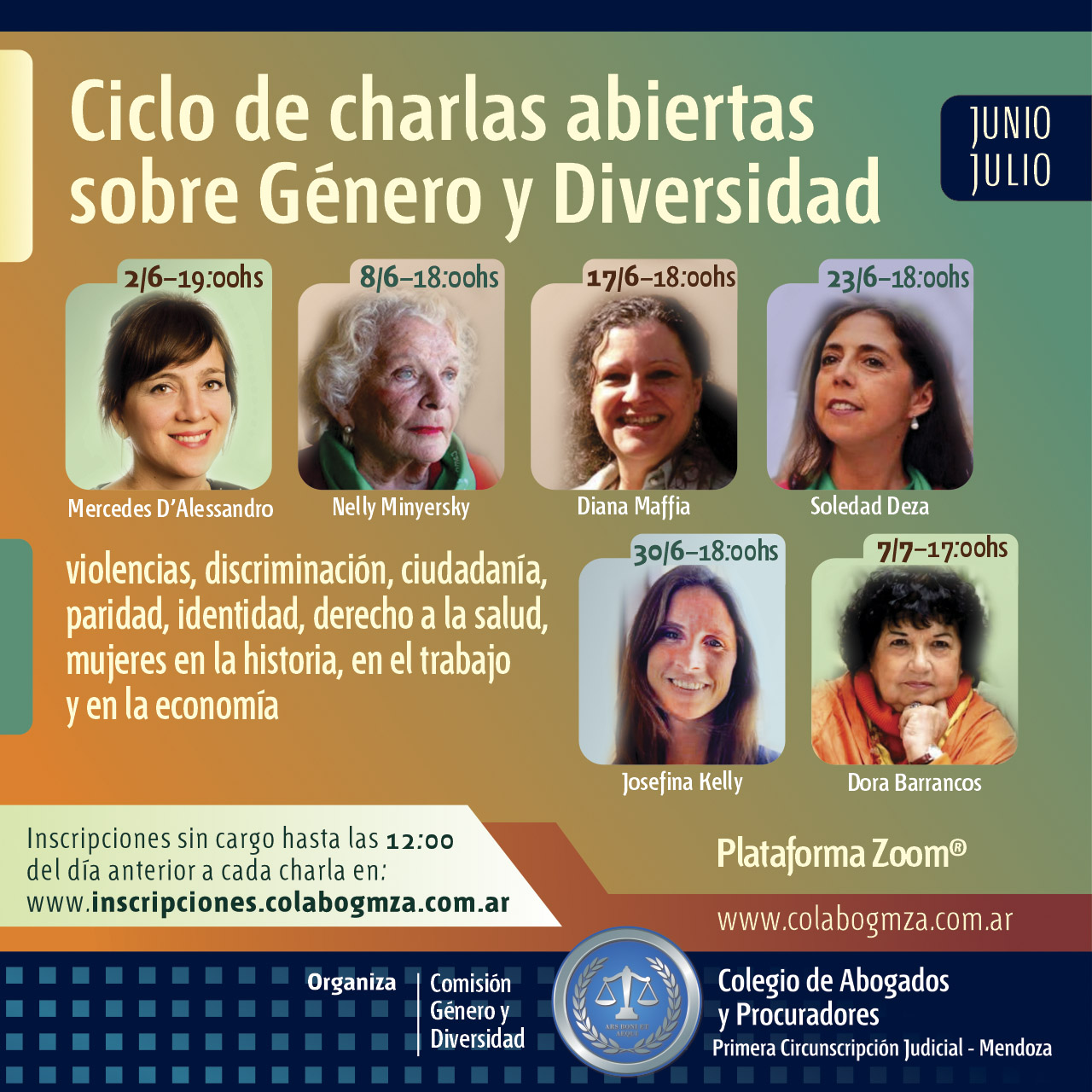 El ciclo, gratuito y abierto, tendrá lugar una vez por semana con la presencia de una referente en cada charla. Está destinado a abogados, sociólogos, historiadores, comunicadores, periodistas, integrantes de la sociedad civil, estudiantes y público en general. Las expositoras son autoras de libros, publicaciones y además tienen participación destacada en diversos espacios de la sociedad civil. Comenzará el martes 2 de junio a las 19. Los interesados en sumarse al Zoom del Colegio podrán anotarse completando un formulario on line hasta el día antes a las 12 en: inscripciones.colabogmza.com.ar