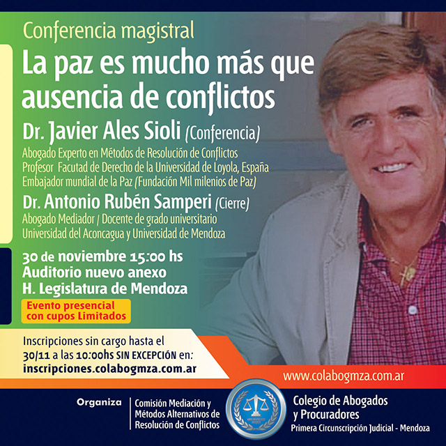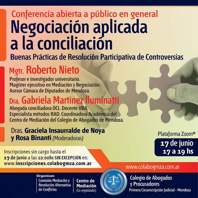 “Transformando conflictos en oportunidades” es el nombre de un taller destinado a profesionales del derecho interesados en formarse en resolución de los conflictos de manera no adversarial. Se realizará el 31 de mayo, 11, 28 de junio y 5 de julio, de 16 a 18.30, en la sede del Colegio ubicada en calle Pedro Molina 447 de Ciudad.
