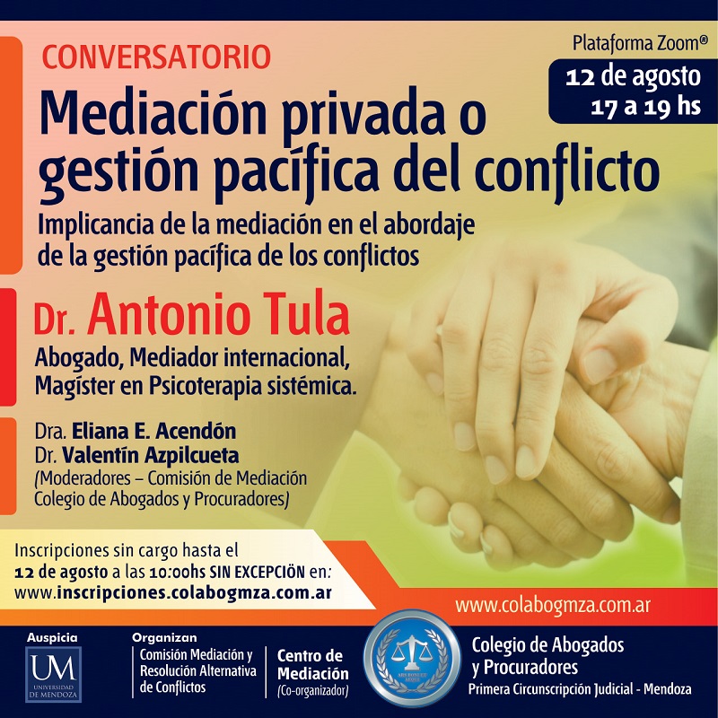Antonio Ricardo Tula es abogado mediador, magister en Psicoterapia Sistémica, magister en Mediación y Negociación, egresado de’Theory and Tools of the Harvard Negotiation Project’ (Universidad de Harvard). Es director de “Redes Alternativas “y “Dispute Resolution Mechanism SA”, especialista en Mediación Familiar. Docente en Resolución de Conflicto en diversas Universidades de Latinoamérica y España. Miembro del Cuerpo de Mediadores del Poder Judicial de Mendoza.