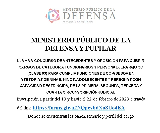 La Defensoría General de la Nación llamó a concursos para cubrir cargos de defensor/a público/a curador/a —Defensoría Pública Curaduría N°4— (CONCURSO Nº198, MPD) y de defensor/a público/a de Menores e Incapaces ante los Juzgados Nacionales de Primera Instancia en lo Civil, Comercial y del Trabajo –Defensoría Nº3- (CONCURSO Nº199, MPD).