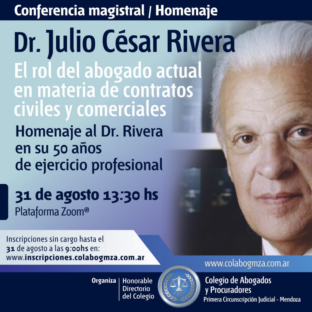 “El rol del abogado actual en materia de contratos civiles y comerciales” es el tema de una clase magistral que ofrecerá Julio César Rivera en el Zoom del Colegio y que servirá como excusa para hacerle un homenaje por sus 50 años de ejercicio profesional.