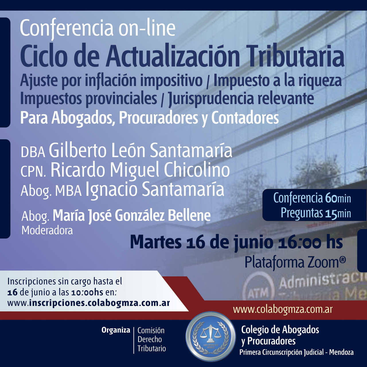 Abordará el ajuste por inflación impositivo, el impuesto a la riqueza, impuestos provinciales y jurisprudencia relevante. Será on line, por Zoom, el martes 16 de junio a las 16. Las inscripciones se podrán tramitar hasta el mismo día a las 10 en: inscripciones.colabogmza.com.ar
