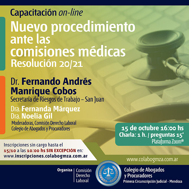 El encuentro gratuito, está programado para el viernes 15 de octubre a las 16 y contará con la moderación de Fernanda Márquez y Noelia Gil, de la Comisión de Derecho Laboral del Colegio de Abogados y Procuradores de la Primera Circunscripción Judicial de Mendoza.
