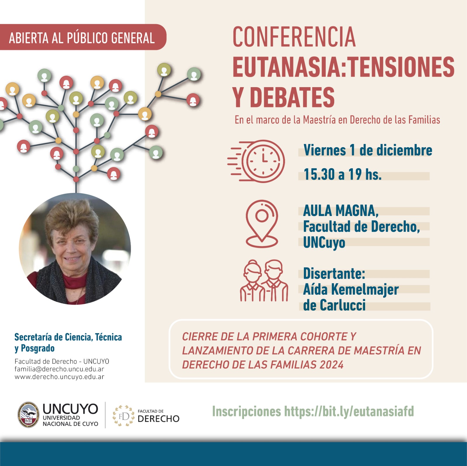 La Facultad de Derecho de la UNCuyo realizará una conferencia titulada “Eutanasia: tensiones y debates”. Se realizará el viernes 1 de diciembre en el Aula Magna de la Facultad de Derecho, de 15.30 y a 19. Las inscripciones son gratuitas y se pueden realizar a través del siguiente enlace: https://bit.ly/eutanasiafd.
