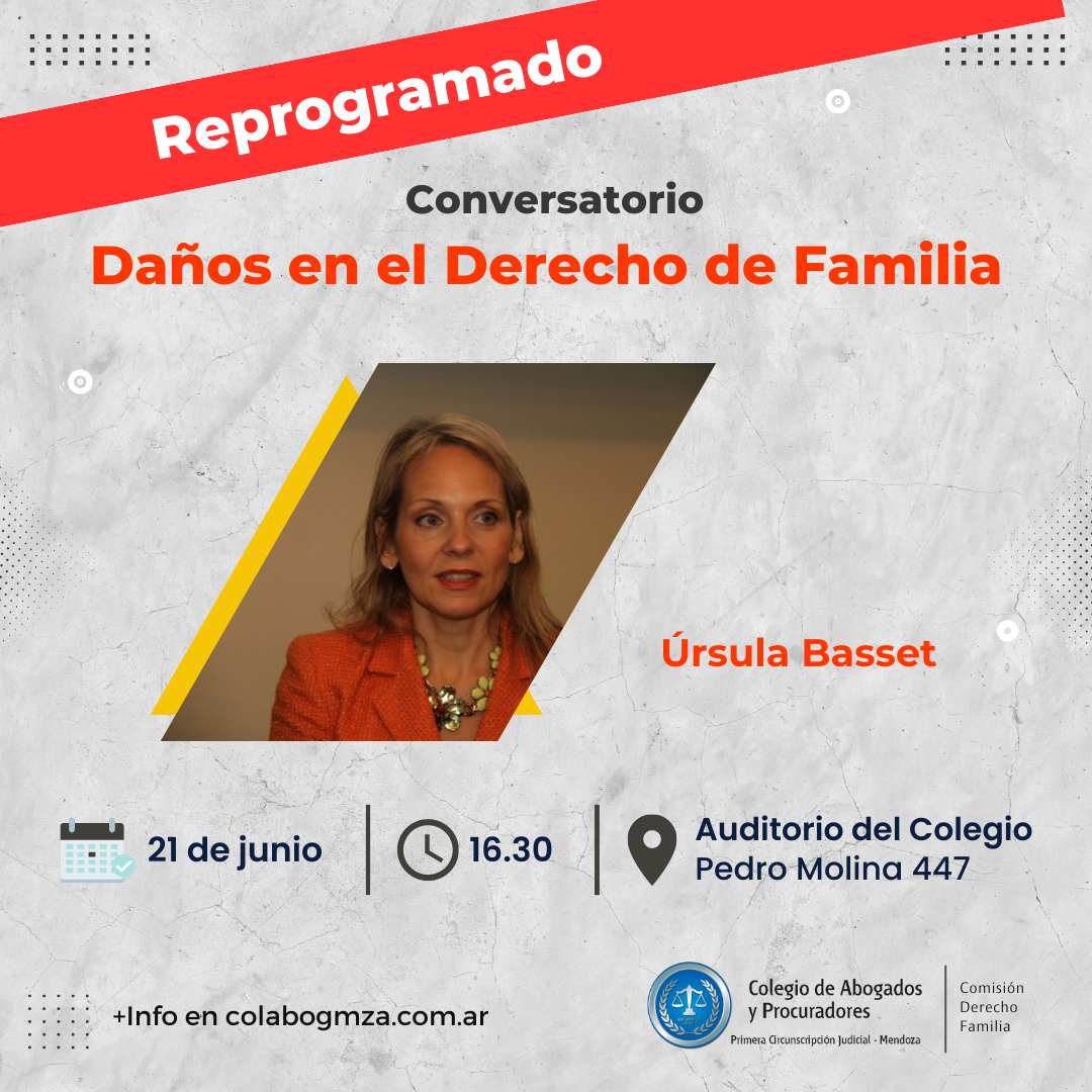 El Colegio de Abogados de Mendoza informó que se reprogramará el conversatorio de Úrsula Basset que iba a dictarse el miércoles 21 de junio, titulado “ Daños en el Derecho de Familia”. La nueva fecha se comunicará oportunamente por este medio y a través de las redes sociales oficiales del Colegio.