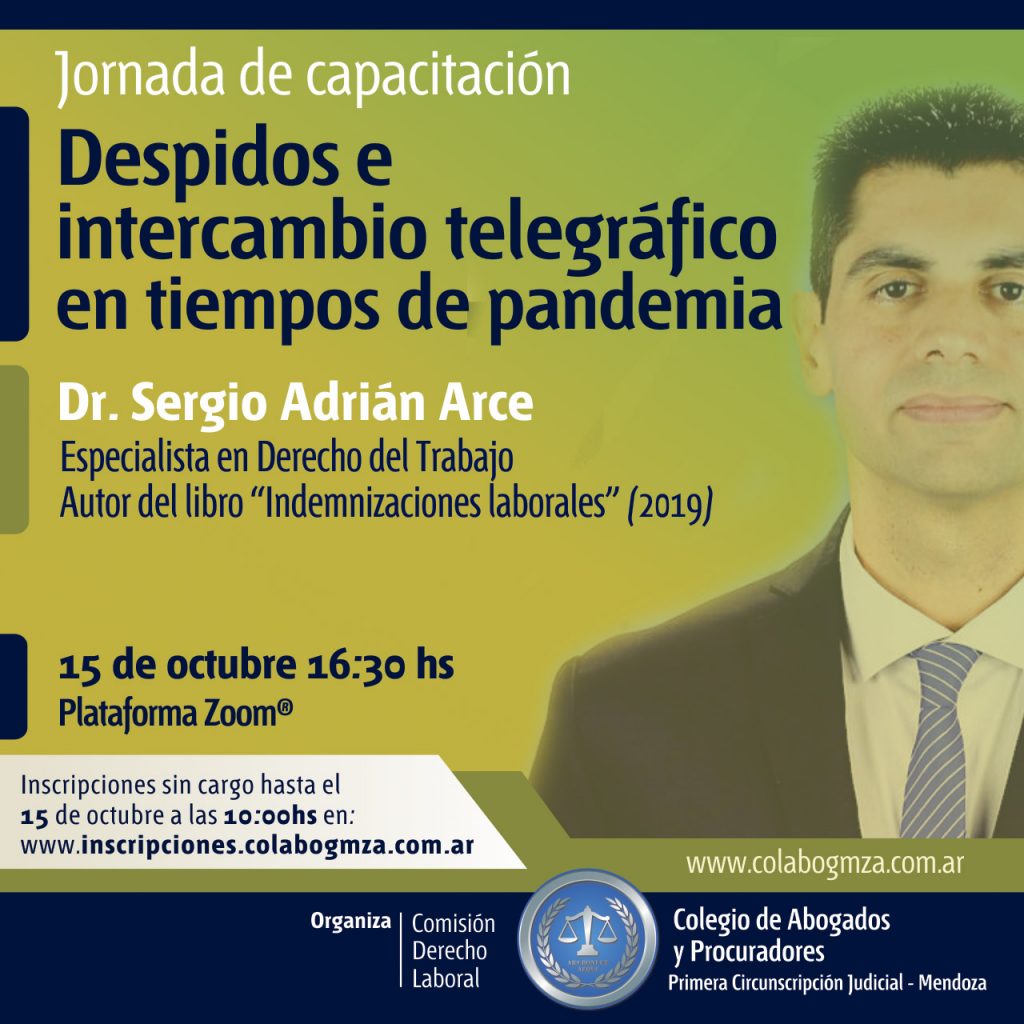 Un encuentro libre y gratuito analizará despidos e intercambio telegráfico en tiempos de pandemia. Se trata de una jornada de capacitación de la Comisión de Derecho Laboral del Colegio de Abogados y Procuradores de la Primera Circunscripción Judicial.
