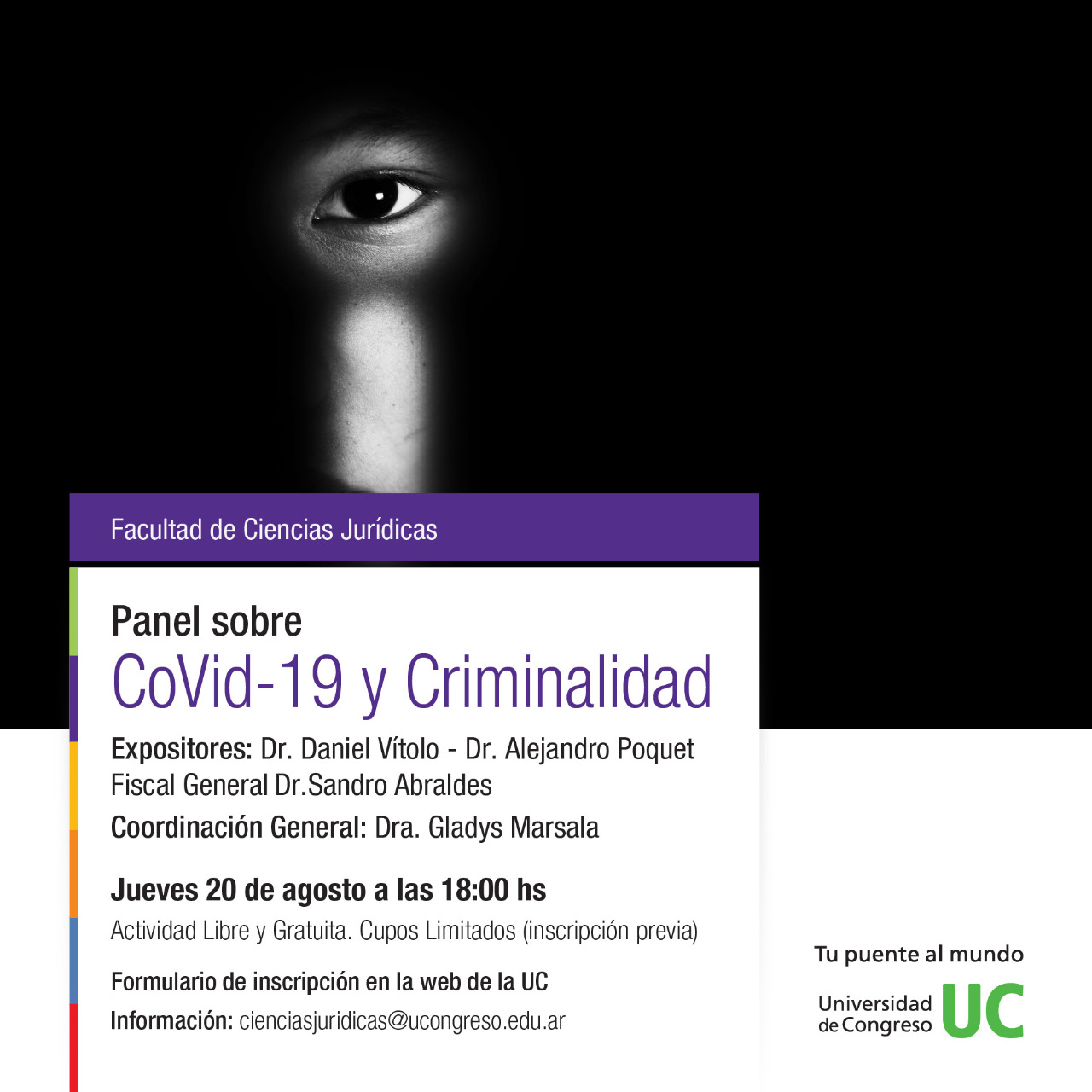 Daniel Vítolo, Alejandro Poquet y Sandro Abraldes expondrán sobre Covid-19 y Criminalidad. Se trata de una actividad libre y gratuita de la Facultad de la Facultad de Ciencias Jurídicas de la Universidad de Congreso.