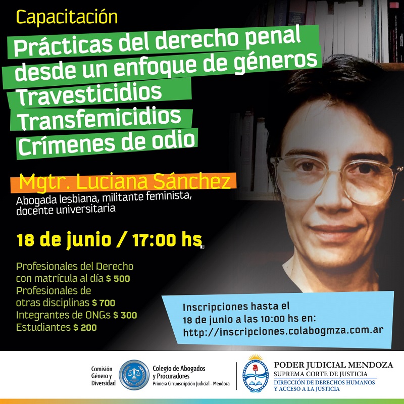 La jornada Prácticas del Derecho Penal desde un enfoque de géneros. Travesticidios, Transfemicidios, Crímenes de odio está prevista para el viernes 18 de junio a las 17, cuando la especialista, Luciana Sánchez, profundizará sobre el tema. Los interesados pueden inscribirse a través del formulario ubicado en: inscripciones.colabogmza.com.ar