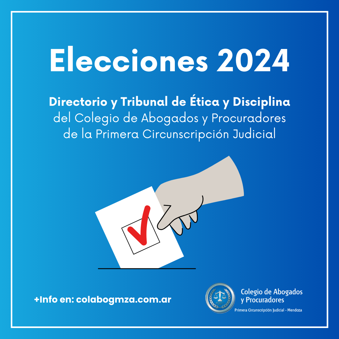 El Colegio de Abogados y Procuradores de la Primera Circunscripción Judicial de Mendoza elegirá a sus nuevas autoridades por el período 2024-2026. Se votarán miembros del Directorio, compuesto por un presidente, un vicepresidente, cinco vocales titulares y tres vocales suplentes. Además se elegirá el Tribunal de Ética y Disciplina, integrado por siete miembros titulares y siete miembros suplentes por igual período.