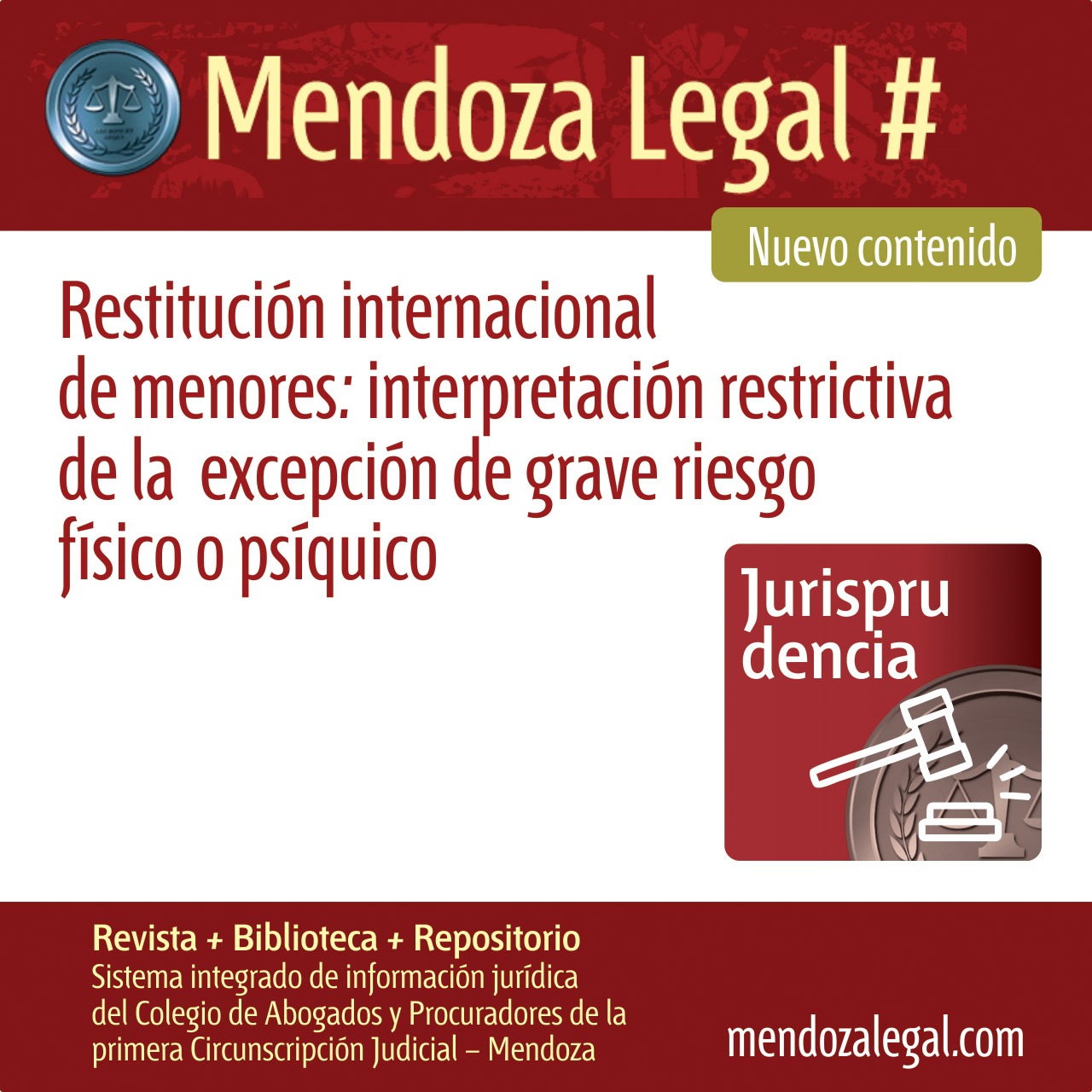Se trata de una decisión de la Corte Suprema de Justicia de la Nación que realiza una interpretación restrictiva de la excepción de grave riesgo físico o psíquico, a la obligación general de restituir a los menores previsto en el Convenio de la Haya. Se puede consultar gratis en el sitio www.mendozalegal.com o aquí debajo.