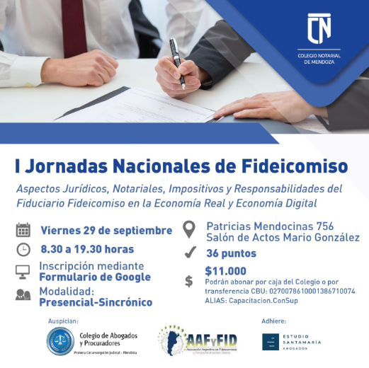 Las I Jornadas Nacionales de Fideicomiso del Colegio Notarial abordarán aspectos jurídicos, notariales, impositivos, responsabilidad del Fiduciario, fideicomiso en la economía real y economía digital. Tendrán lugar en el salón de actos Mario González, ubicado en Patricias Mendocinas 756 de Ciudad, el viernes 29 de septiembre, de 8.30 a 19.30.