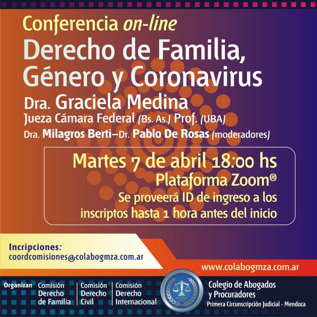 Las comisiones académicas del Colegio de Abogados y Procuradores de la Primera Circunscripción Judicial retoman su actividad a través de plataformas on line. Así las comisiones de Derecho de Familia, Derecho Civil y Derecho Internacional organizaron una conferencia que analizará el Derecho de Familia, Género y Coronavirus.