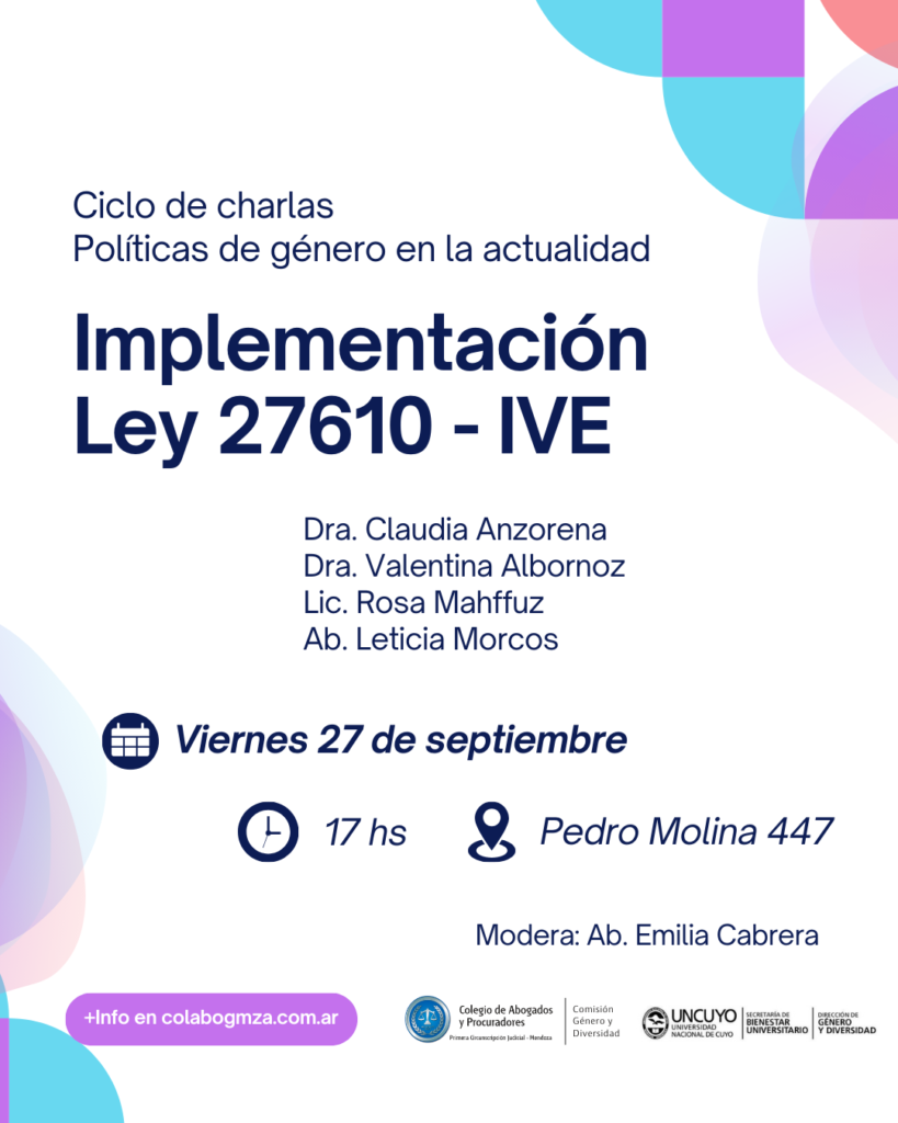La primera será el viernes 27 de septiembre, a las 17, en el Auditorio del Colegio de Abogados y Procuradores de Mendoza, ubicado en Pedro Molina 447 de Ciudad. Abordará los avances, desafíos e implementación de la Ley N° 27.610 y el acceso a la interrupción voluntaria del embarazo. Estará a cargo de la Dra. Claudia Anzorena, representante de la Campaña Nacional por el Derecho al Aborto legal, seguro y gratuito- Regional Mendoza; la Dra. Valentina Albornoz, directora del Programa de Salud Sexual y Reproductiva del Ministerio de Salud Mendoza; la Licenciada en psicología Rosa Mahffuz, representante de Casa FUSA Mendoza y la abogada Leticia Morcos, representante Asociación Civil Líbera feminista. Moderará la Abogada Emilia Cabrera.