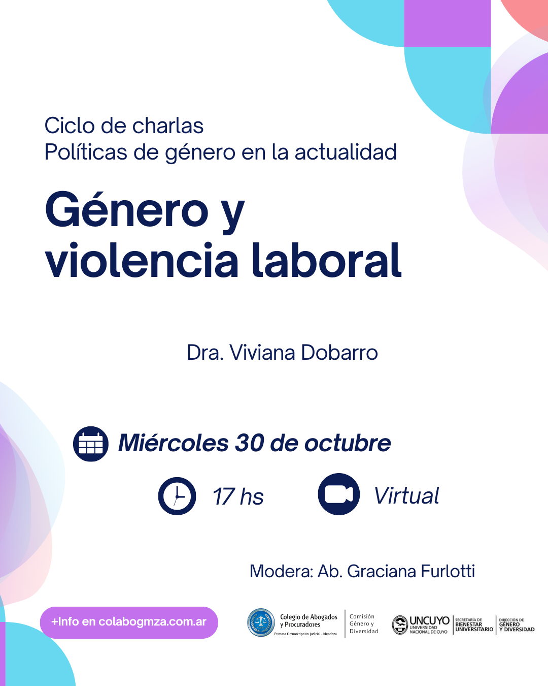 La segunda será virtual, el miércoles 30 de octubre, desde las 17, donde la Dra. Viviana Dobarro, Jueza Nacional del Trabajo, expondrá sobre género y violencia laboral. Moderará esta charla la Abogada Graciana Furlotti.