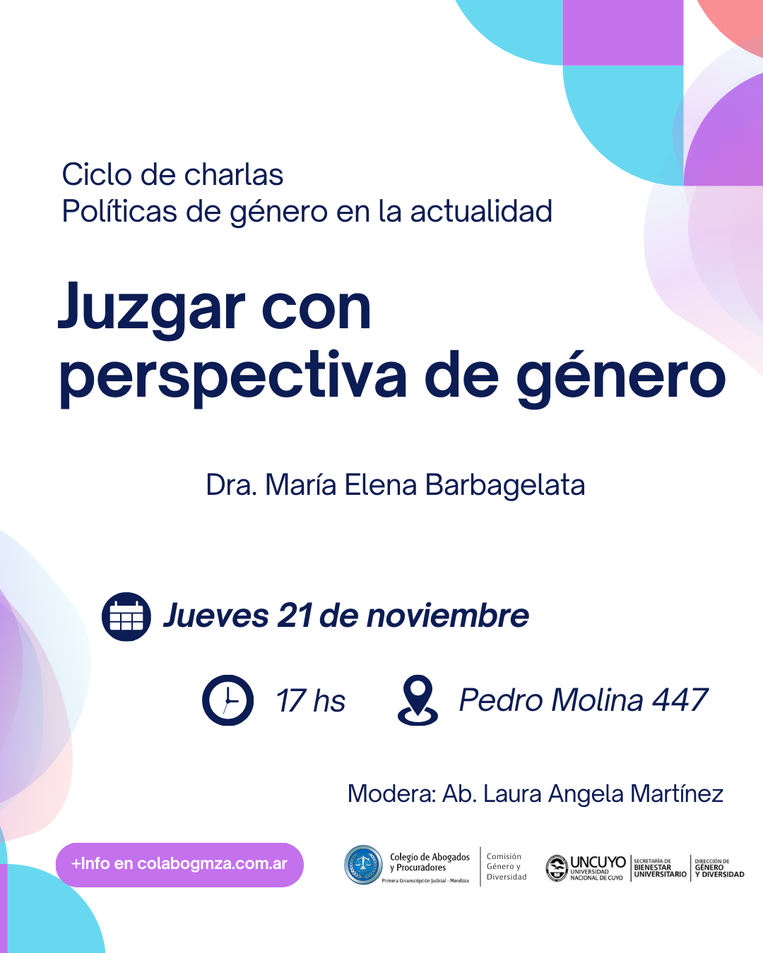 Su objetivo es ofrecer una capacitación que proporcione “Herramientas legales para ejercer el Derecho con perspectiva de género”. Las expositoras encargadas de llevarla adelante son Vanina Abraham y Jimena Martínez Berruete, ambas abogadas integrantes de la Comisión de Género y Diversidad del Colegio de Abogados y Procuradores de Mendoza.