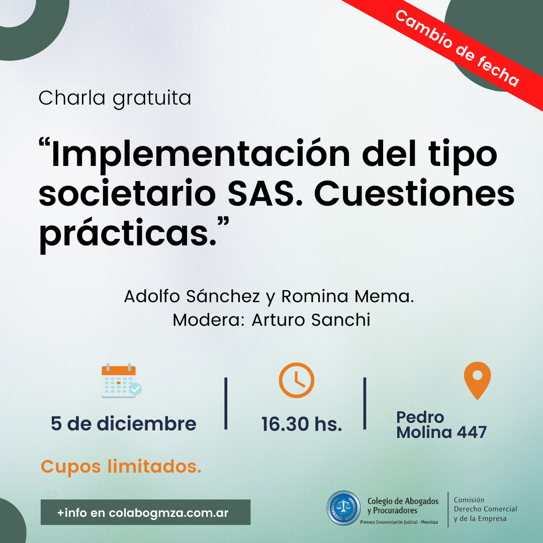 Los especialistas en Derecho Empresario, Adolfo Sánchez y Romina Mema, disertarán en un encuentro de capacitación gratuito denominado “Implementación del tipo societario SAS. Cuestiones prácticas.” Será el lunes 5 de diciembre, a las 16.30, en la sede del Colegio ubicada en calle Pedro Molina 447 de la Ciudad de Mendoza. La propuesta está destinada a público en general interesado en esa rama del Derecho. La moderación de la charla estará a cargo de Arturo Sanchi.
