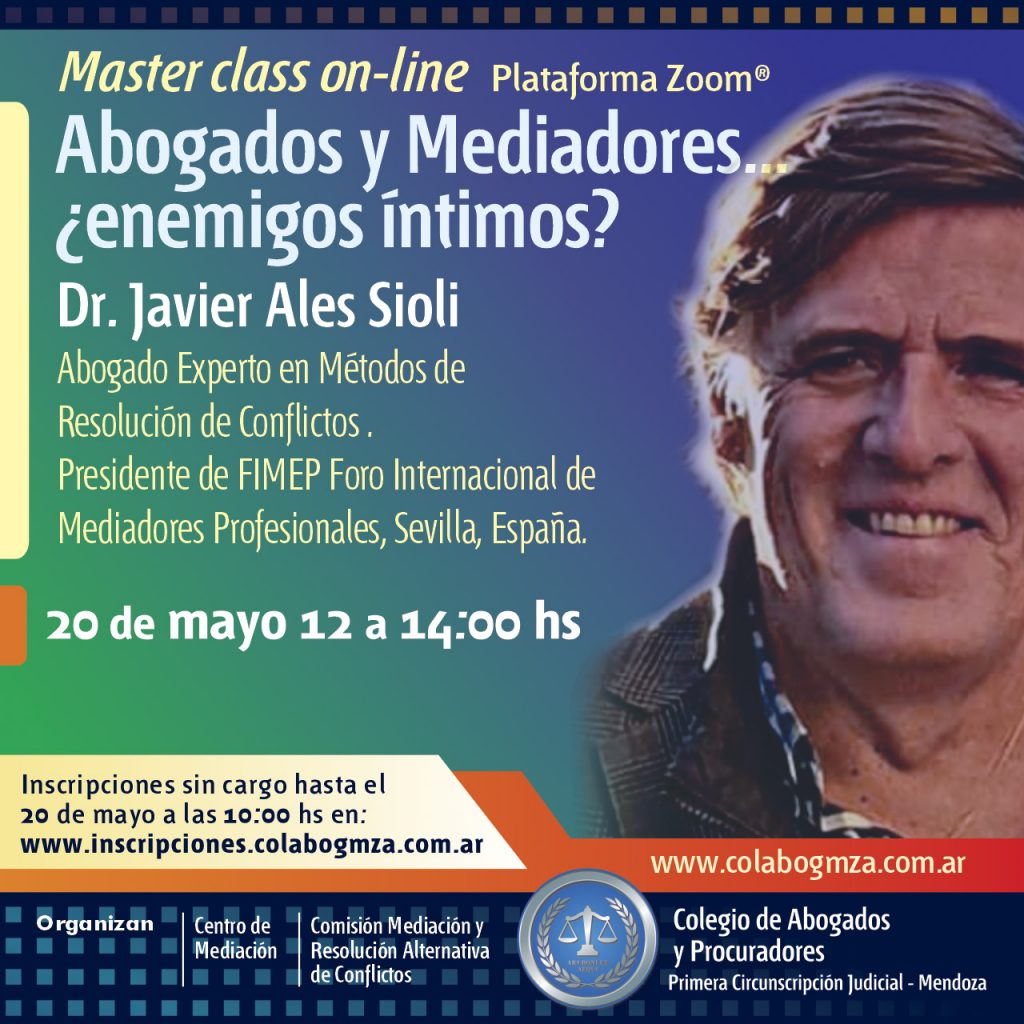 Un abogado, mediador y profesor universitario español de renombre internacional, Javier Ales Sioli, dictará una clase magistral en el Colegio de Abogados y Procuradores de Mendoza. El encuentro será gratuito y está programado para el miércoles 20 de mayo a las 12. Inscripciones on line en: inscripciones.colabogmza.com.ar hasta las 10.