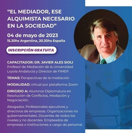 La Universidad Maza realizará el webinar «El mediador, ese alquimista necesario en la sociedad», el próximo 4 de mayo a las 15:30 (Argentina) y 20:30 (España). En el encuentro expondrá Javier Ales Sioli, reconocido especialista en mediación y director del Foro Internacional de Mediadores Profesionales (FIMEP). La inscripción es gratuita y puede realizarse a través del siguiente enlace: https://forms.gle/wJXLRhB3YyXocPRS8.