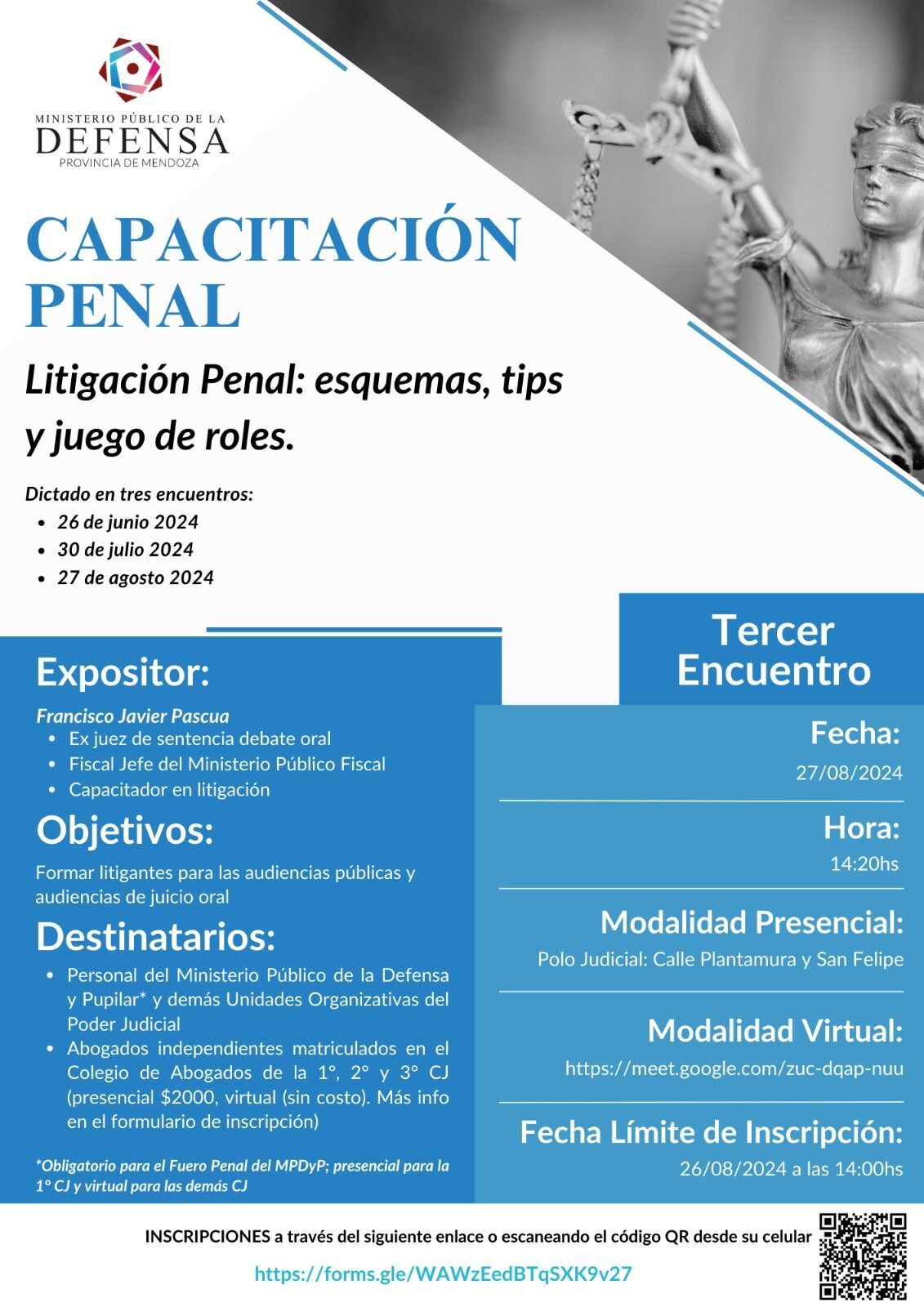 Profesionales podrán participar de una capacitación sobre «Litigación Penal: esquemas, tips, y juego de roles». El tercer encuentro, a cargo del ex juez de sentencia y debate oral Francisco Javier Pascua, se realizará el 27 de agosto, a las 14.20 hs. Los interesados podrán participar de manera presencial en el Polo Judicial de Mendoza o de forma virtual.