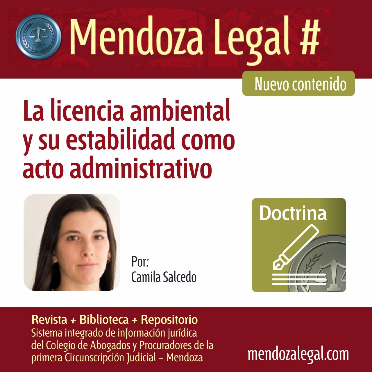 Mendoza Legal es el sistema integrado de información jurídica del Colegio de Abogados y Procuradores de la Primera Circunscripción Judicial de Mendoza. Una de sus últimas publicaciones ofrece un artículo sobre licencia ambiental y su estabilidad como acto administrativo.