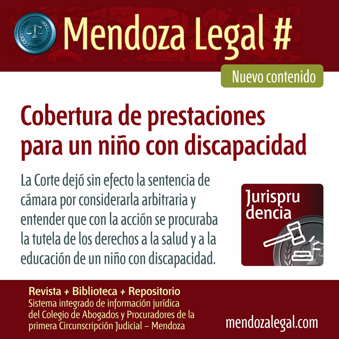 Mendoza Legal es el sistema integrado de información jurídica del Colegio de Abogados y Procuradores de la Primera Circunscripción Judicial de Mendoza. Una de sus últimas publicaciones ofrece un fallo sobre la cobertura de prestaciones para un niño con discapacidad.-