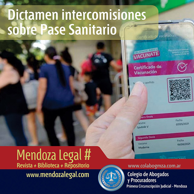 Diferentes Comisiones del Colegio de Abogados comenzaron a analizar, desde el punto de vista jurídico, el tema del pase sanitario, a raíz de la decisión administrativa N°1198/2021 del Jefe de Gabinete de Ministros de la Nación. La norma establece que los habitantes del territorio argentino deben tener el esquema completo de vacunación COVID-19 para concurrir a ciertos espacios o actividades. A partir de estos estudios se hizo un trabajo intercomisiones que confluyó en un dictamen que se presenta a continuación.