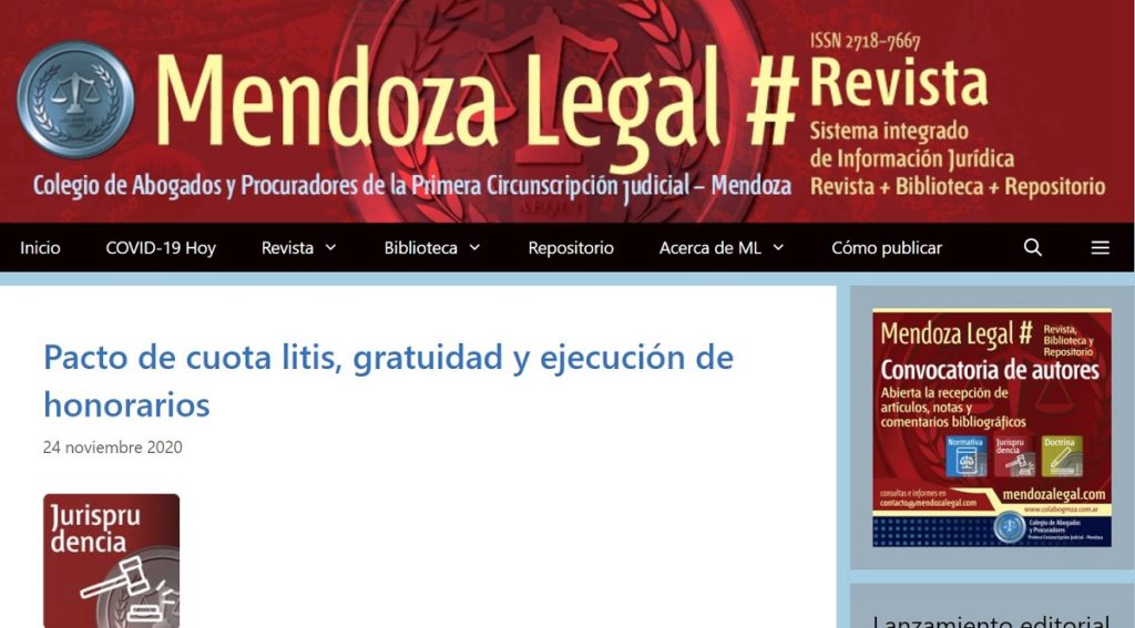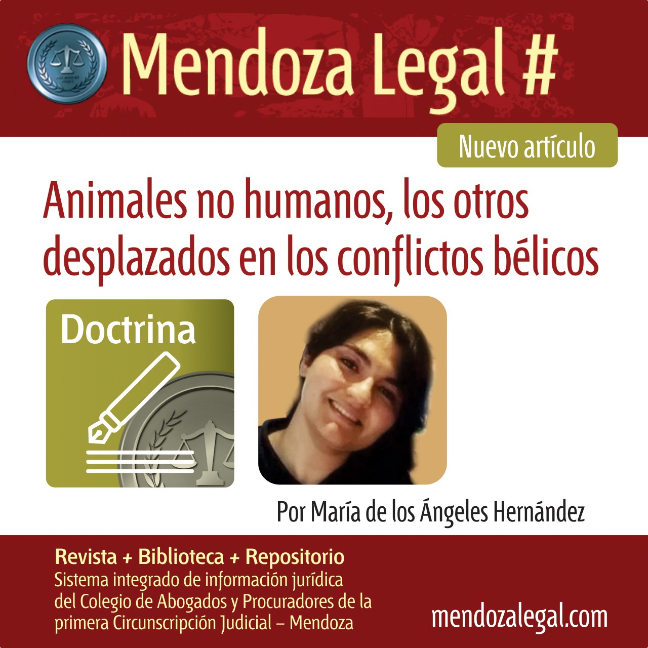Mendoza Legal es el sistema integrado de información jurídica del Colegio de Abogados y Procuradores de la Primera Circunscripción Judicial de Mendoza. Una de sus últimas publicaciones ofrece una nota de opinión de María de los Ángeles Hernandez, miembro de la Comisión de Derecho Animal, titulada «Animales no humanos, los otros desplazados en los conflictos bélicos».