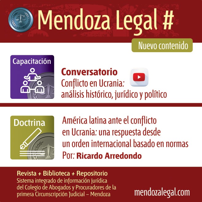 Mendoza Legal es el sistema integrado de información jurídica del Colegio de Abogados y Procuradores de la Primera Circunscripción Judicial de Mendoza. Dos de sus últimas publicaciones ofrecen material relativo al conflicto en Ucrania.