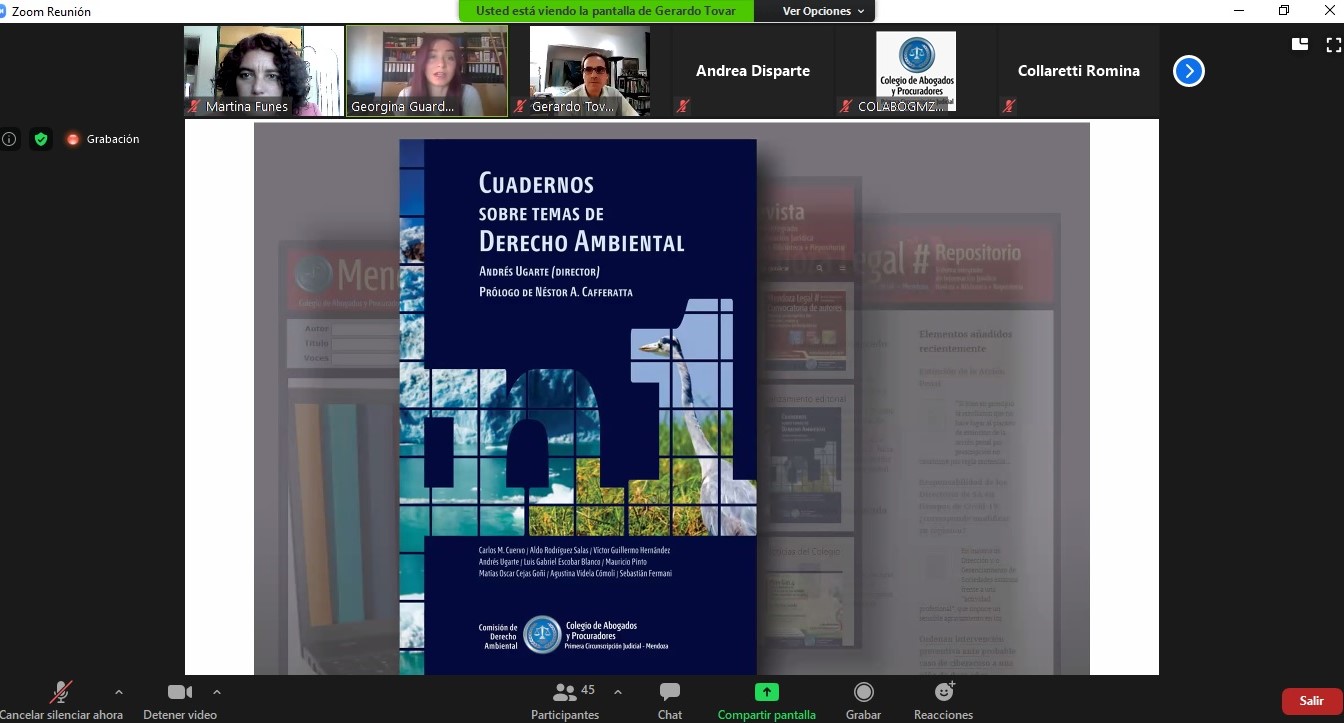 Participarán de la presentación de la publicación, Andrea Disparte, presidente del Colegio de Abogados y directora de Mendoza Legal; Carlos Cuervo y Andrés Ugarte, presidente y vicepresidente de la Comisión de Derecho Ambiental y el doctor Guillermo Acuña, prologuista de la obra y actual asesor legal y Jefe de Protocolo de la Comisión Económica para América Latina y el Caribe de las Naciones Unidas (CEPAL) en Santiago, Chile. Interesados podrán inscribirse en: inscripciones.colabogmza.com.ar